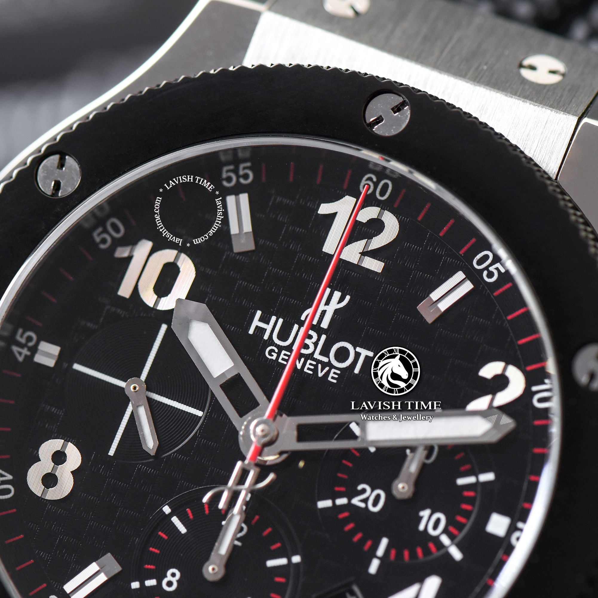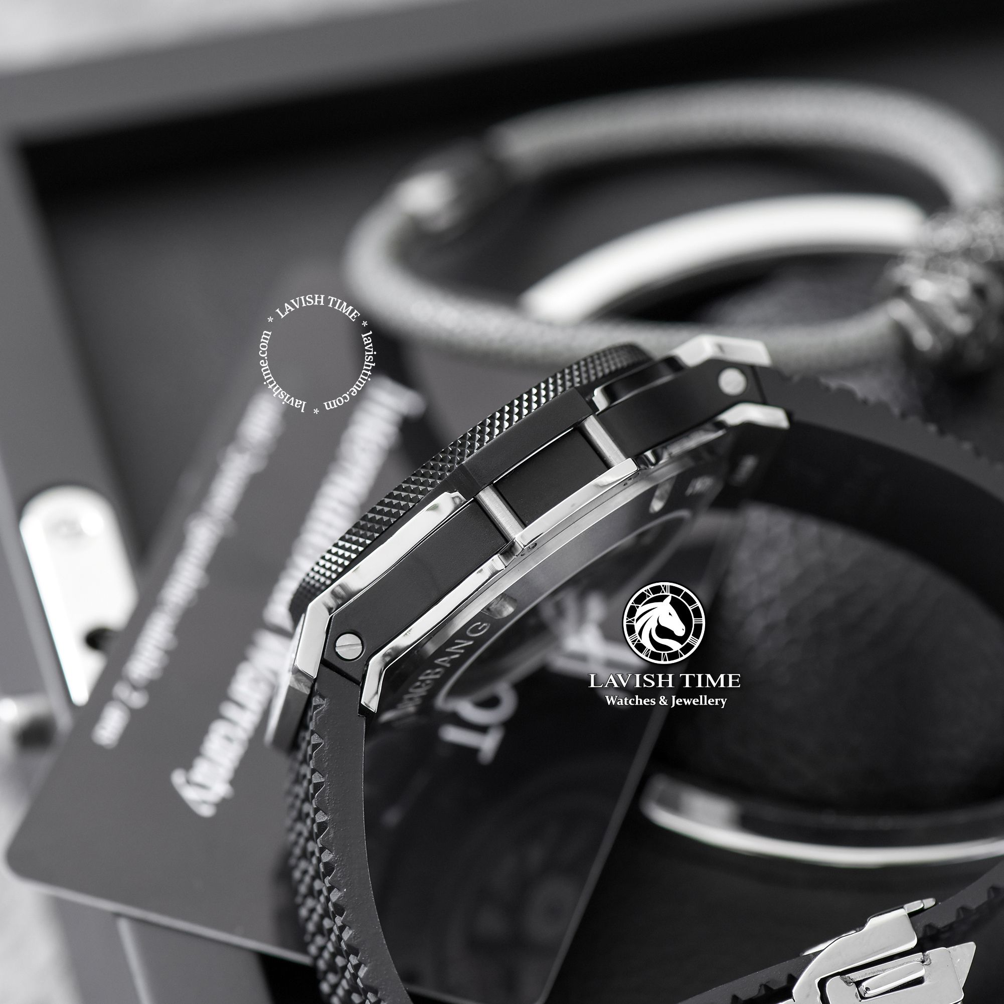Điểm nhấn đặc biệt ở mẫu này là vành bezel làm từ gốm Ceramic màu đen được đánh bóng và cố định bởi các đinh vít Titanium hình chữ H quen thuộc - đây cũng là một chi tiết đặc trưng đã đi vào huyền thoại của thương hiệu Hublot.