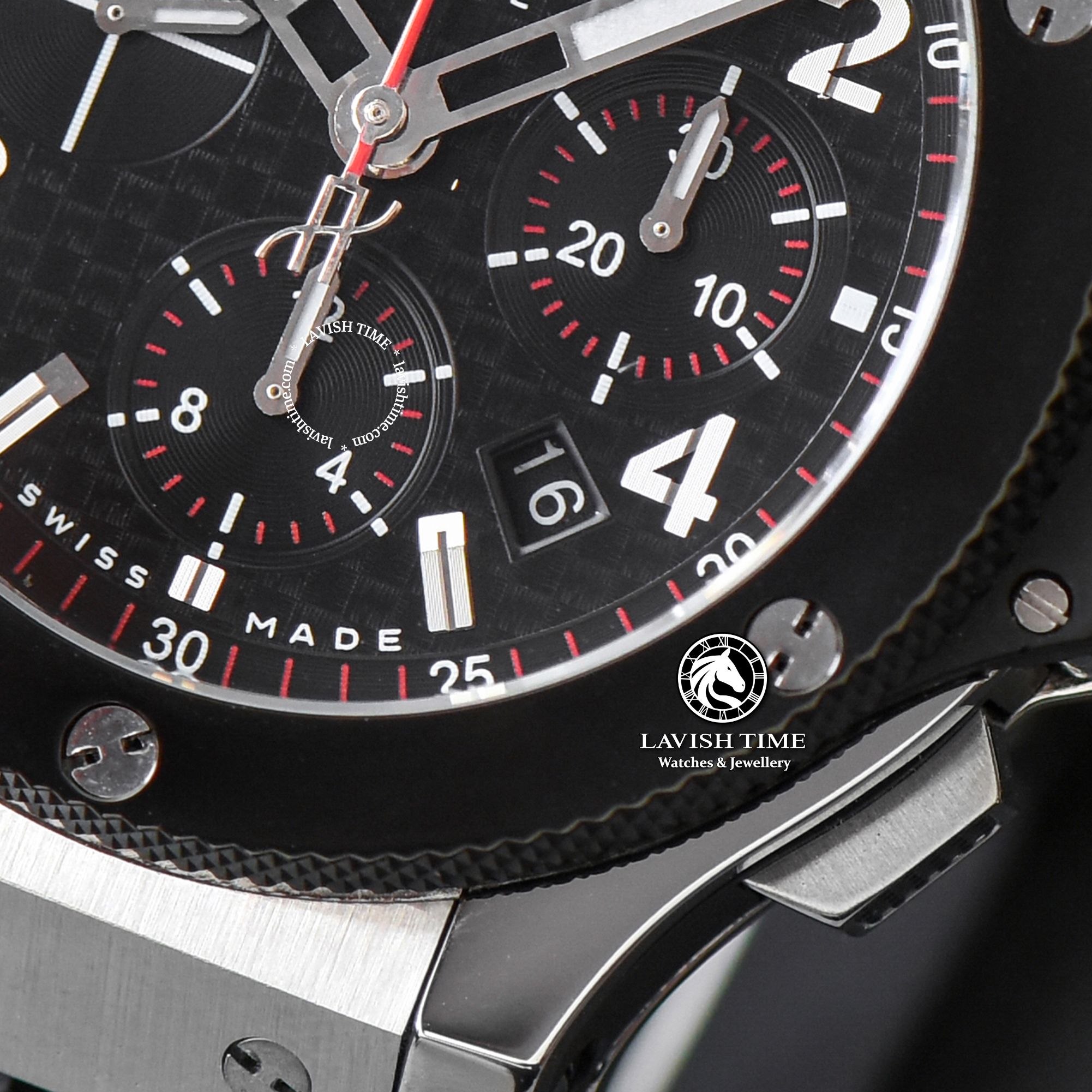 Bên cạnh đó, hệ thống cọc chỉ giờ và bộ kim nằm ở phần trung tâm đều mang một sắc vàng nổi bật trên mặt số màu đen, chỉ riêng kim giây Chronograph lại mang một sắc đỏ khác biệt, đậm chất thể thao, và góp phần khiến mặt số trở nên dễ đọc, sinh động hơn. Không chỉ vậy, những chiếc kim này còn được phủ lớp phát quang có khả năng phát sáng trong bóng tối.