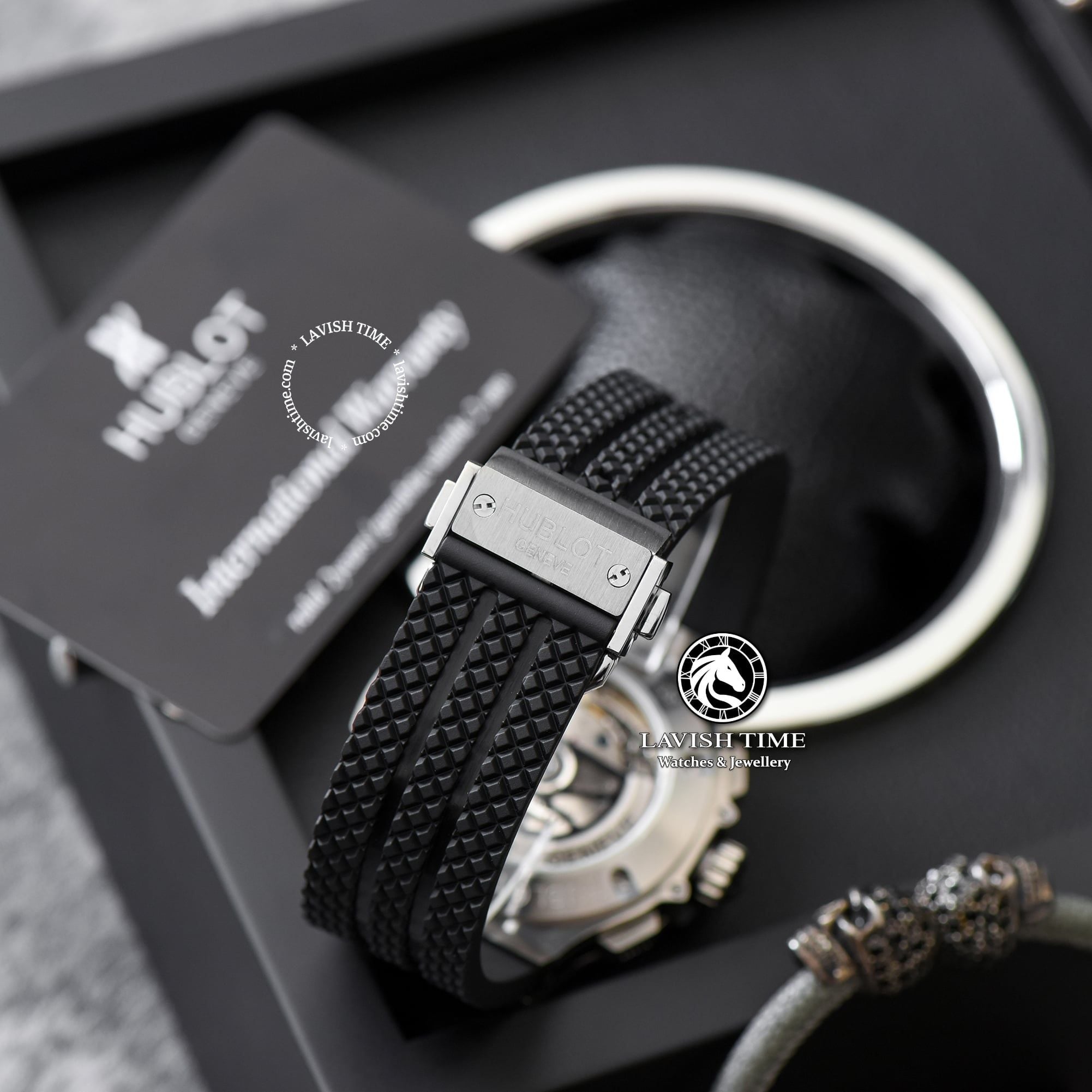 Và cuối cùng, bộ dây cao su là một trong những điểm nhấn quan trọng của Hublot, vừa có sự mềm mại, vừa có độ ma sát tốt ôm chặt lấy cổ tay, và vừa có khả năng chống nước hoàn hảo. Bộ dây được thiết kế khá là ấn tượng khi được trang trí thêm các họa tiết gai góc khiến bề mặt bộ dây trở nên gồ ghề giống như bánh xe, càng làm tăng thêm vẻ thể thao, mạnh mẽ cho tổng quan chiếc đồng hồ. Ngoài ra, chúng ta có thêm bộ khóa gập có khắc tên thương hiệu ở trên.