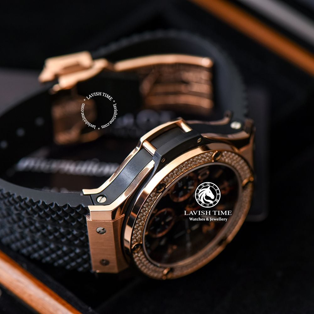 Đồng Hồ Hublot Big Bang 44mm Rep 1:1 Chế Tác Vỏ Vàng Hồng Niềng Đính Đá 2 Hàng Mặt Đen Dây Cao Su 341.PX.130.RX.114