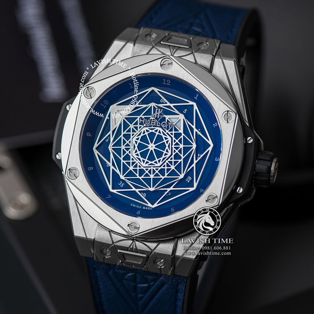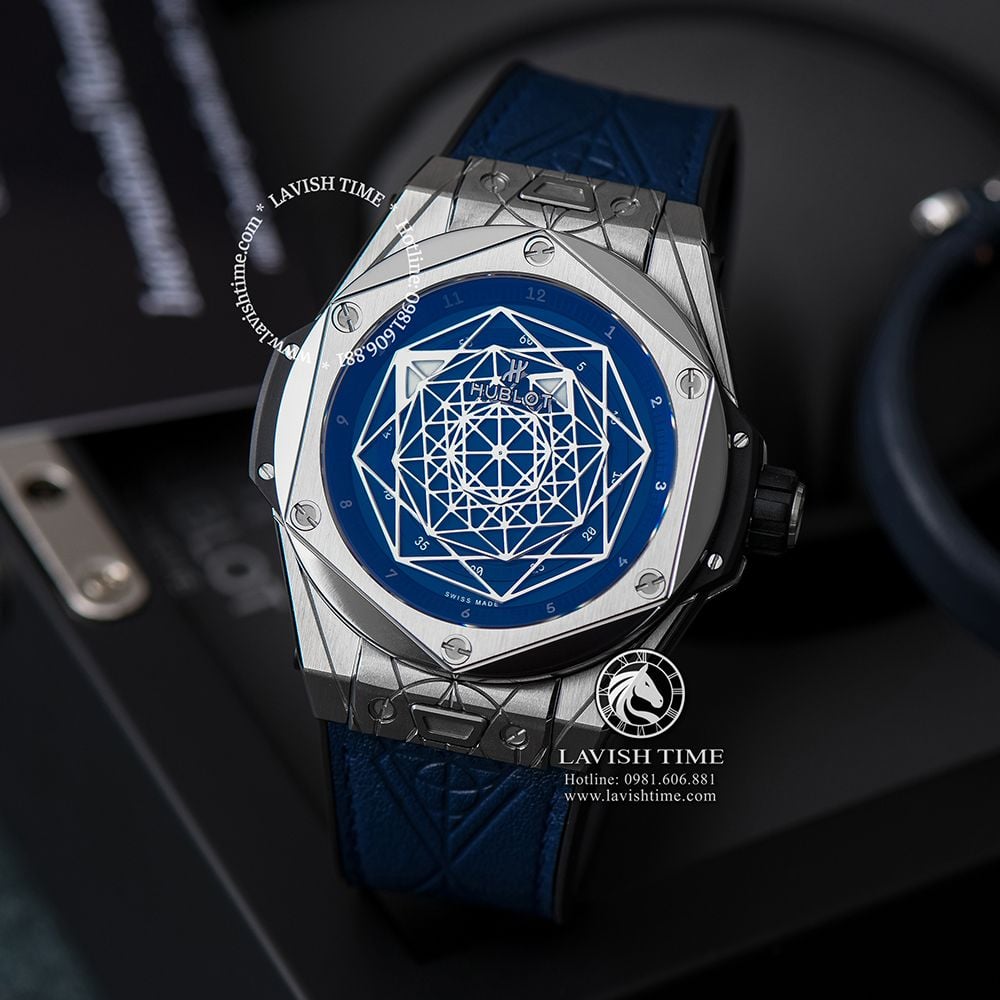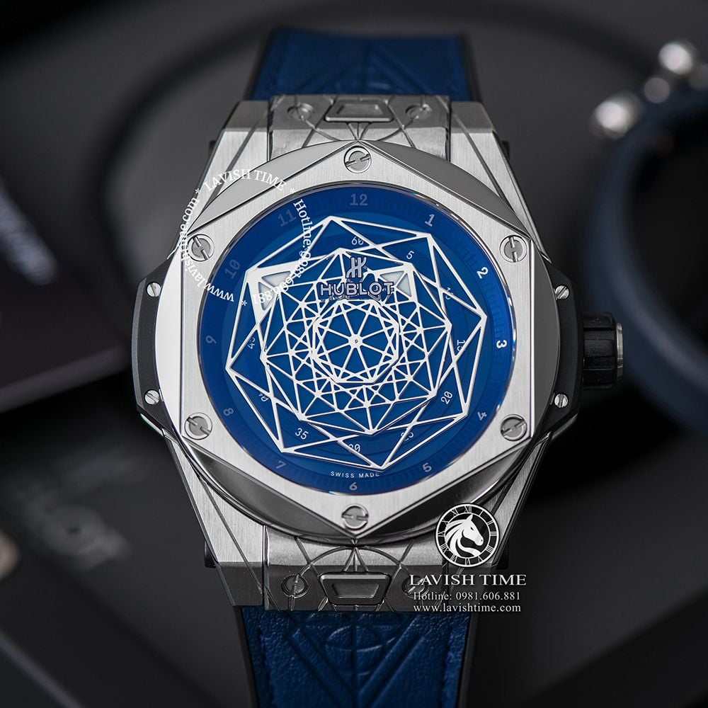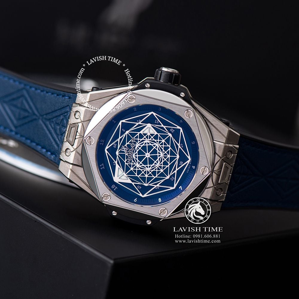 Đồng hồ Hublot Big Bang Sang Bleu trang bị bộ dây đeo cao cao su có bề mặt da màu xanh cao cấp với đường vân ăn khớp với họa tiết hình học trên mặt đồng hồ.