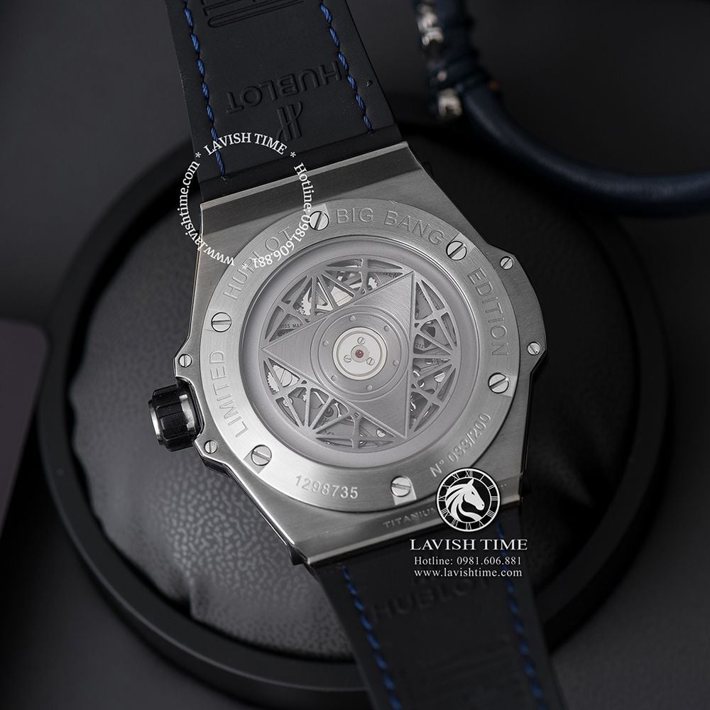 Một trong những model thuộc phiên bản giới hạn được săn đón khá nhiều bởi người chơi phải kể đến đó là Hublot Big Bang Sang Bleu 415.NX.7179.VR.MXM18 được chế tác với chất liệu vỏ thép cứng cáp với kích thước 45mm thể hiện được phong cách mạnh mẽ nhưng vẫn vô cùng tinh tế, trở thành sự lựa chọn không thể thiếu của các quý ông hiện đại.