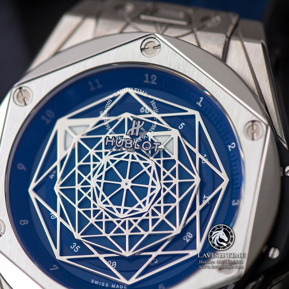 Ngoài ra, chiếc đồng hồ còn sở hữu một mặt số hình lục giác là hệ thống hình học sắc nhọn xếp chồng ăn ý đầy nghệ thuật, có khả năng gây ấn tượng mạnh. Bộ vỏ khung sandwich đa chất liệu 5 lớp xếp tầng được làm từ thép không gỉ cứng cáp có độ bền cao và được chả xước mờ tinh tế. Cùng với đó là các đinh tán tạo hình chữ H đẹp mắt và tinh tế nằm ngay ngắn trên bề mặt benzel - đây chính là chi tiết mang đậm nét đặc trưng của thương hiệu Hublot.