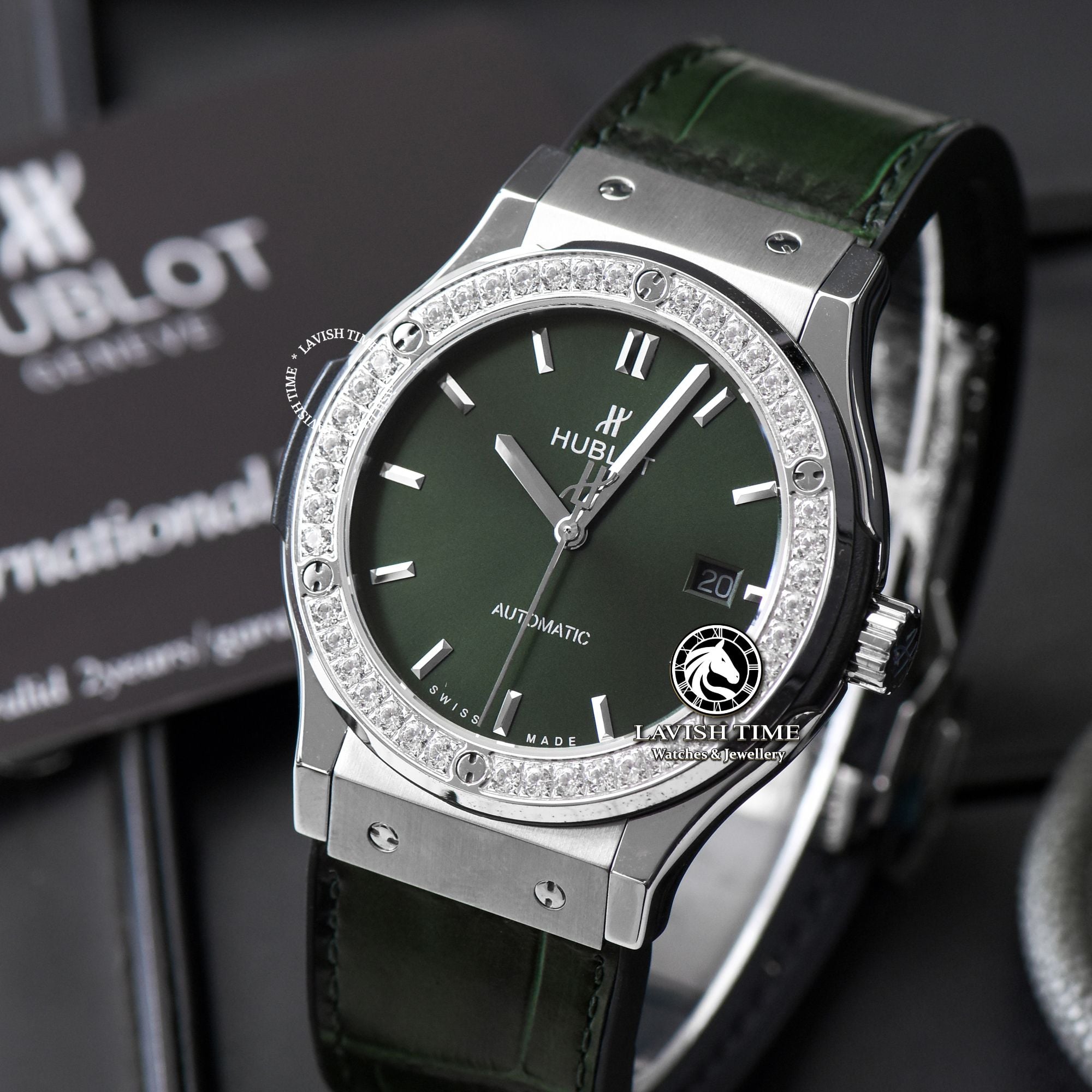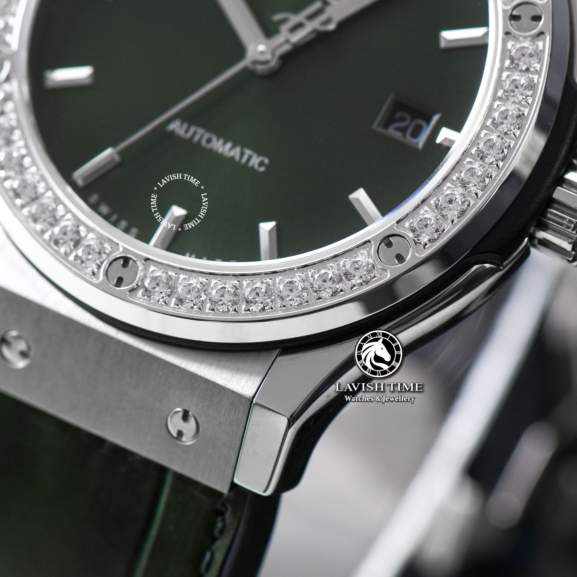 Giới thiệu Đồng Hồ Hublot Classic Fusion 42mm Vỏ Bạc Niềng Bezel Đính 1 Hàng Đá Mặt Số Xanh Lá 542.NX.8970.LR