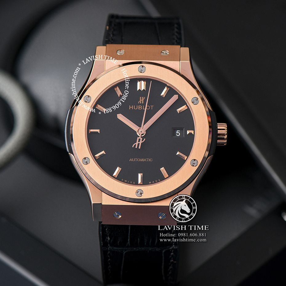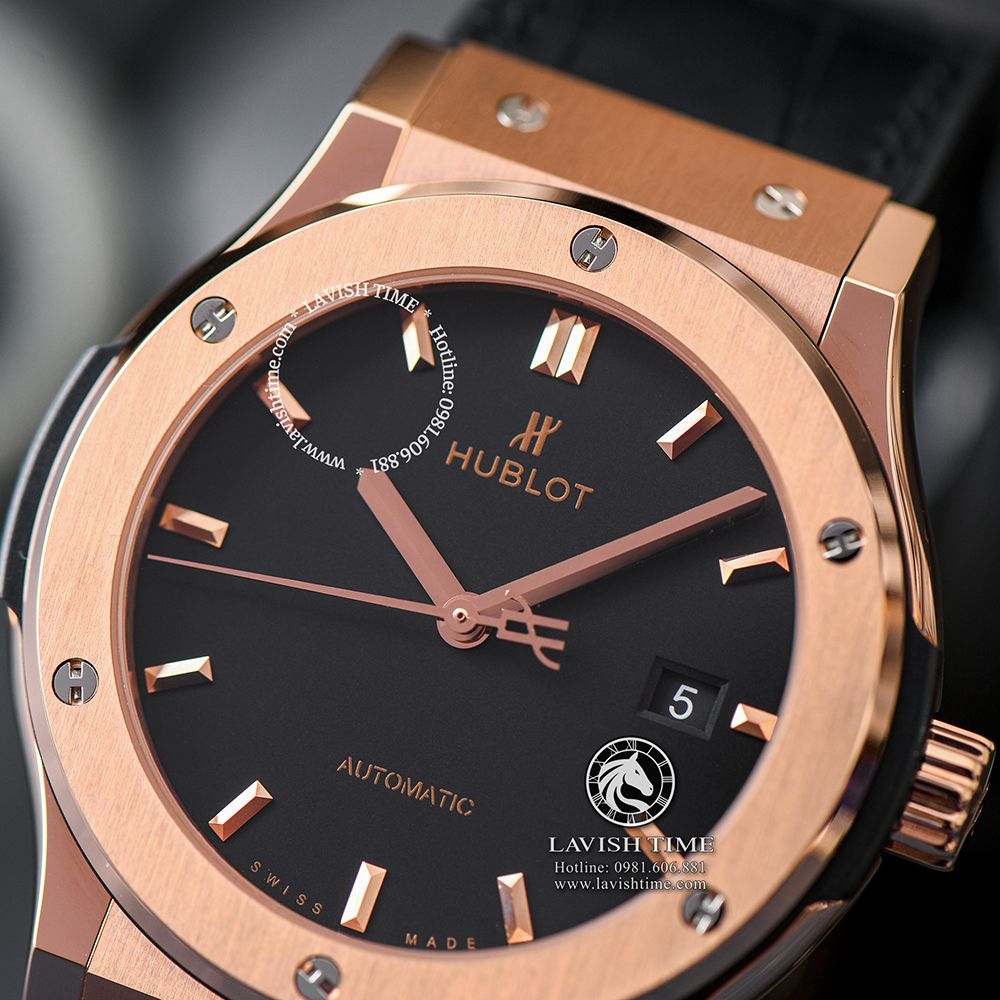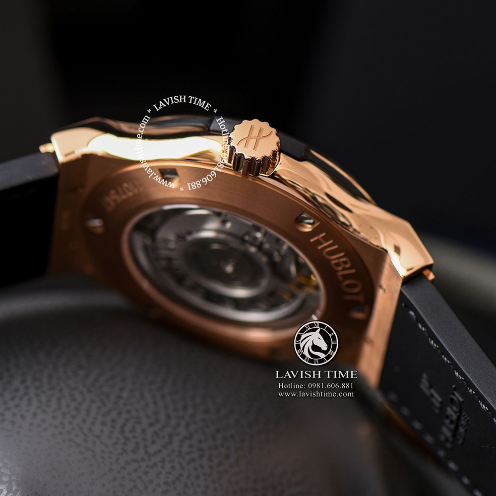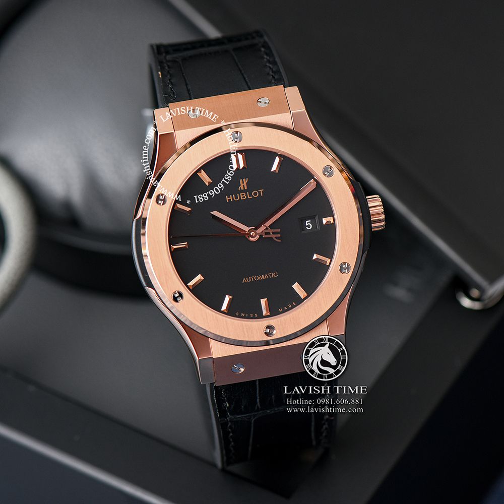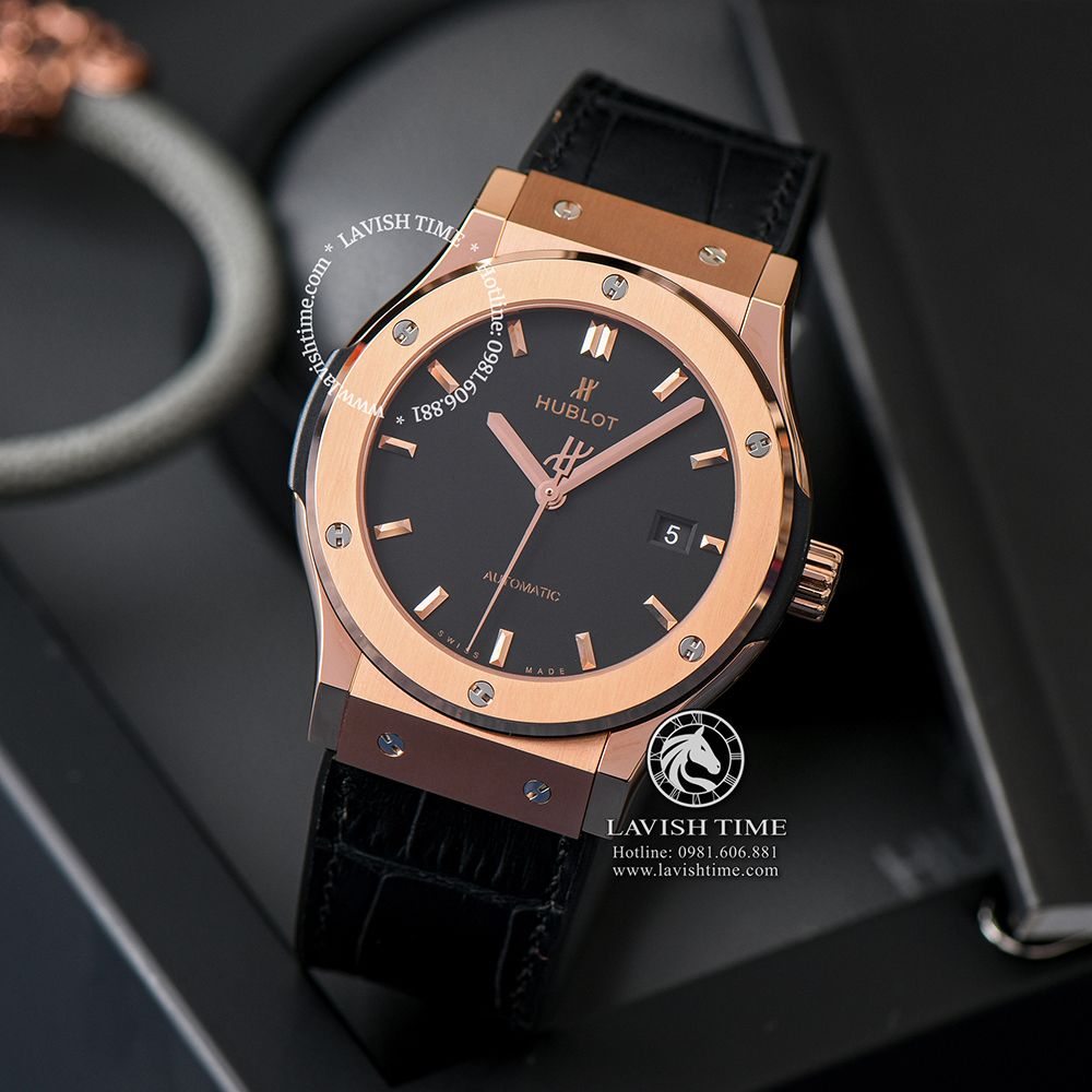 Đồng Hồ Hublot Classic Fusion 42mm Rep 1:1 Chế Tác Vỏ Vàng Hồng Titanium Mặt Số Đen Dây Cá Sấu 542.OX.1181.LR