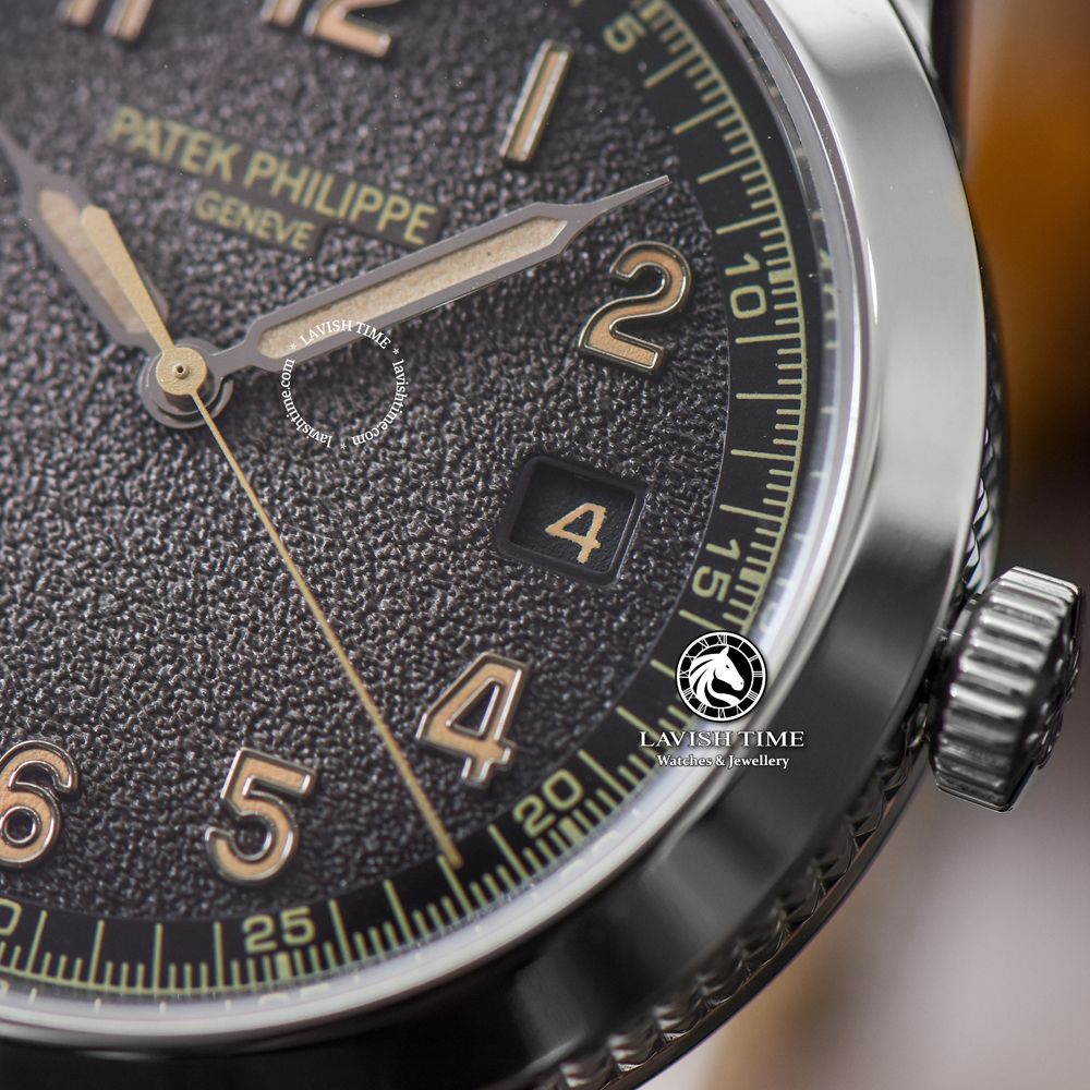 Bộ kim được thiết kế theo dáng cổ điển phủ dạ quang phát sáng cực kì tiện lợi khi sử dụng. Ở góc 3 giờ, chúng ta có thêm ô cửa sổ lịch ngày quen thuộc. Chi tiết này được đóng khung viền trắng, với các góc cạnh được đánh bóng cẩn thận. Toàn bộ các chi tiết ở trên được điều khiển bởi bộ máy Miyota 9015 nâng cấp thành Patek Philippe Caliber 330 S C chuẩn Auth.