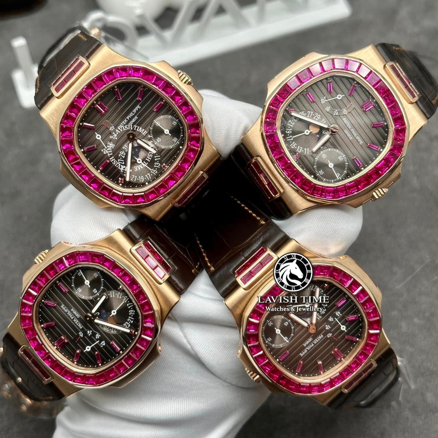 Đồng Hồ Patek Philippe Nautilus 5724/12R Rep 1:1 Chế Tác Vỏ Vàng Khối 18K Niềng Bezel Đính Ruby Hồng Dây Da