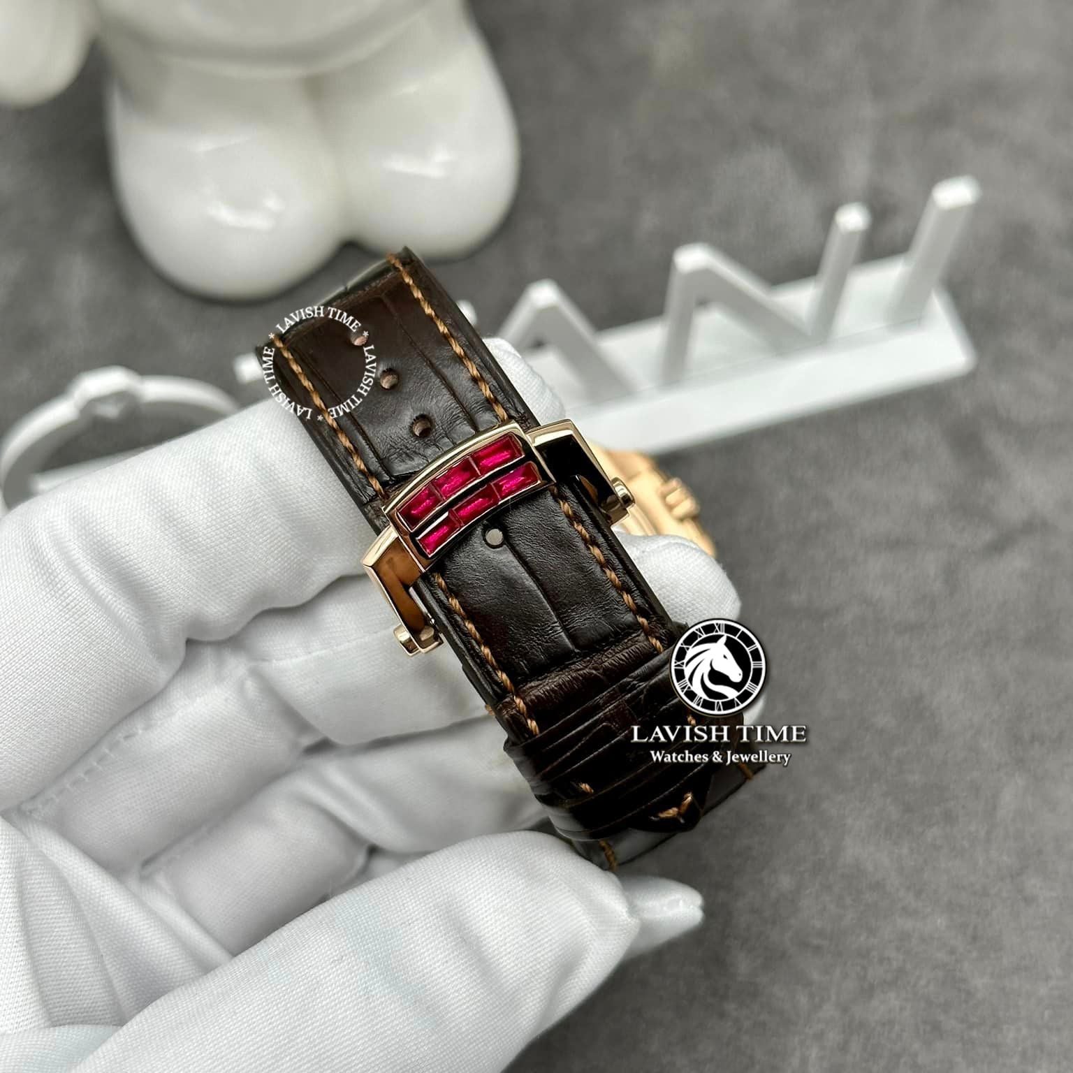 Bộ khung vỏ bằng vàng khối 18K có chất lượng tốt và màu sắc đúng màu hãng nhất. Vốn đã rất nổi bật nay được trang hoàng thêm những viên ruby nên càng lung linh, tỏa sáng. Đá ruby được cắt bằng phương pháp baguette nên khả năng phát sáng tối ưu.