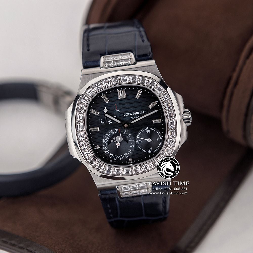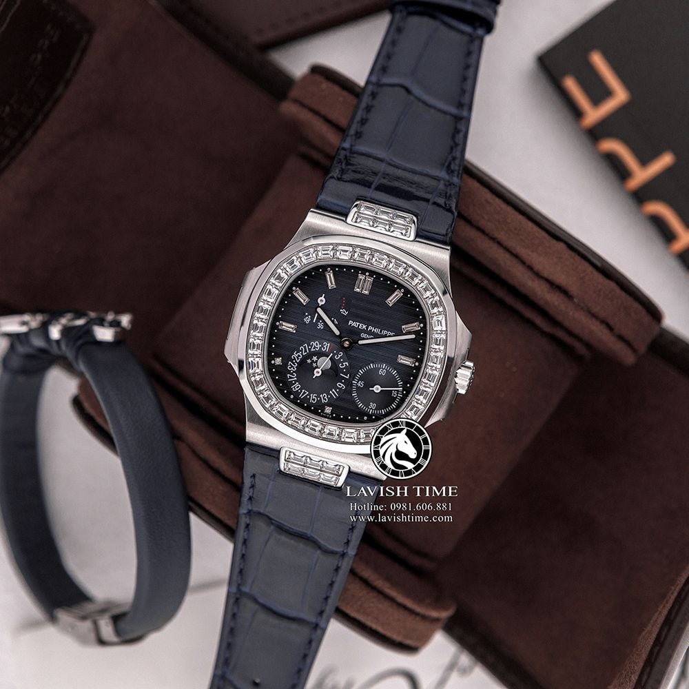 Đồng Hồ Patek Philippe Nautilus 5724/G-001 Rep 1:1 Chế Tác Vỏ Bạc Niềng Bezel Đính Đá Mặt Xanh Dương Dây Da