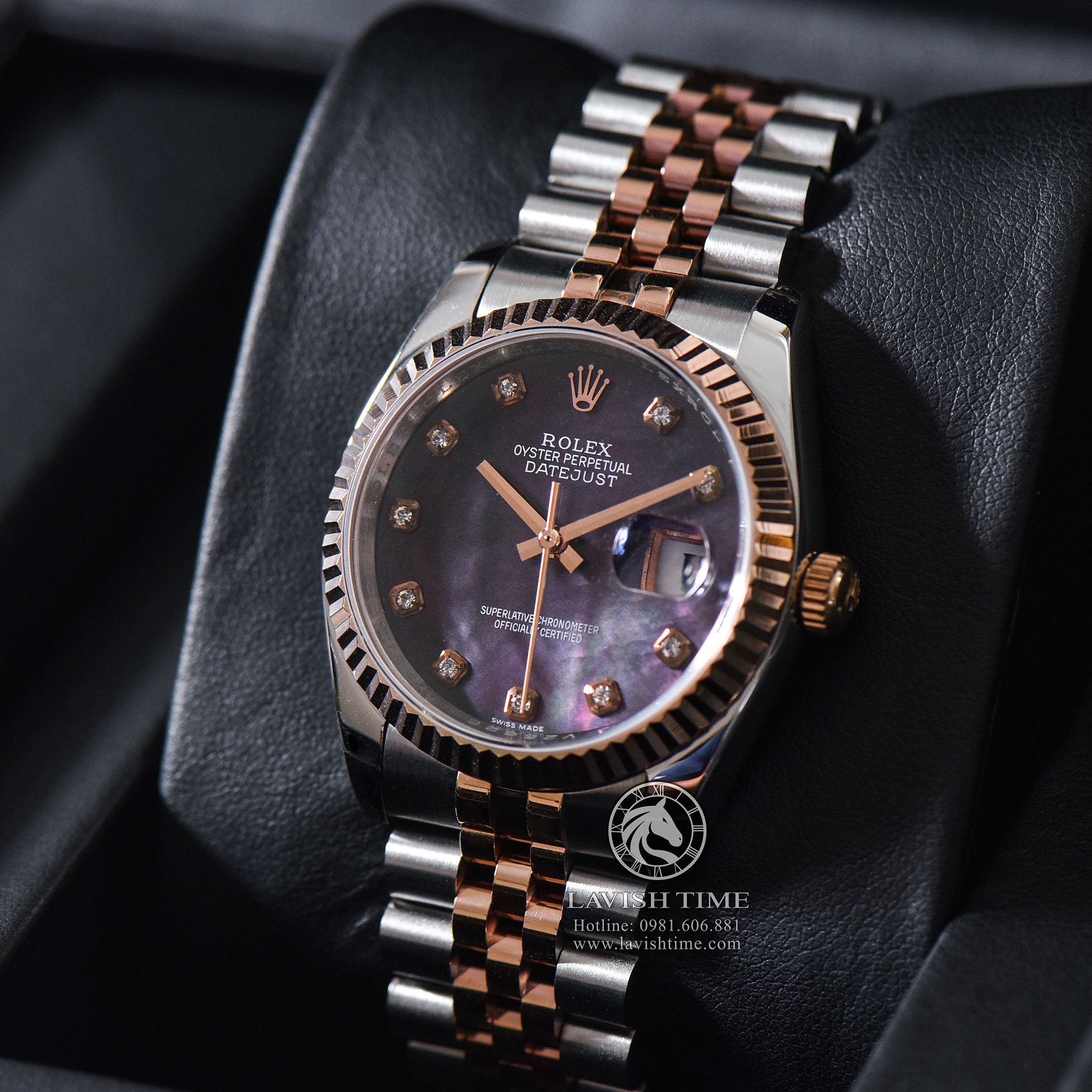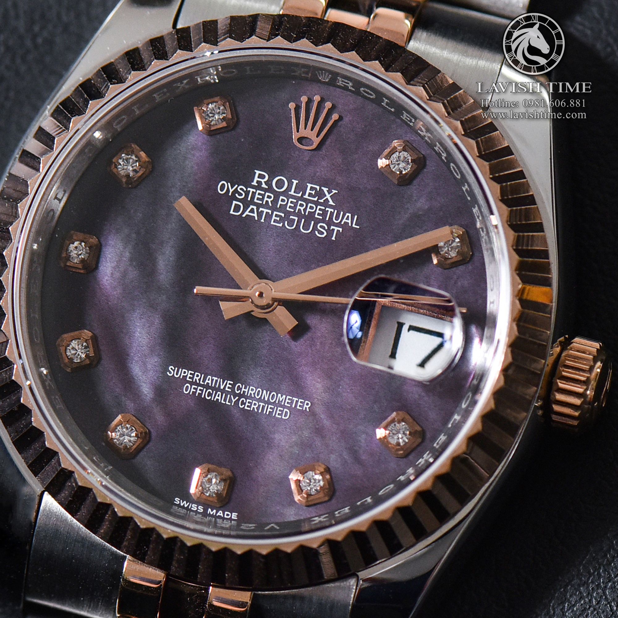 Đồng Hồ Rolex Datejust 36mm 116231 Rep 1:1 Cao Cấp Vỏ Demi Vàng Hồng Mặt Xà Cừ Tím Cọc Số Đính Đá Đây Kim Loại Jubilee