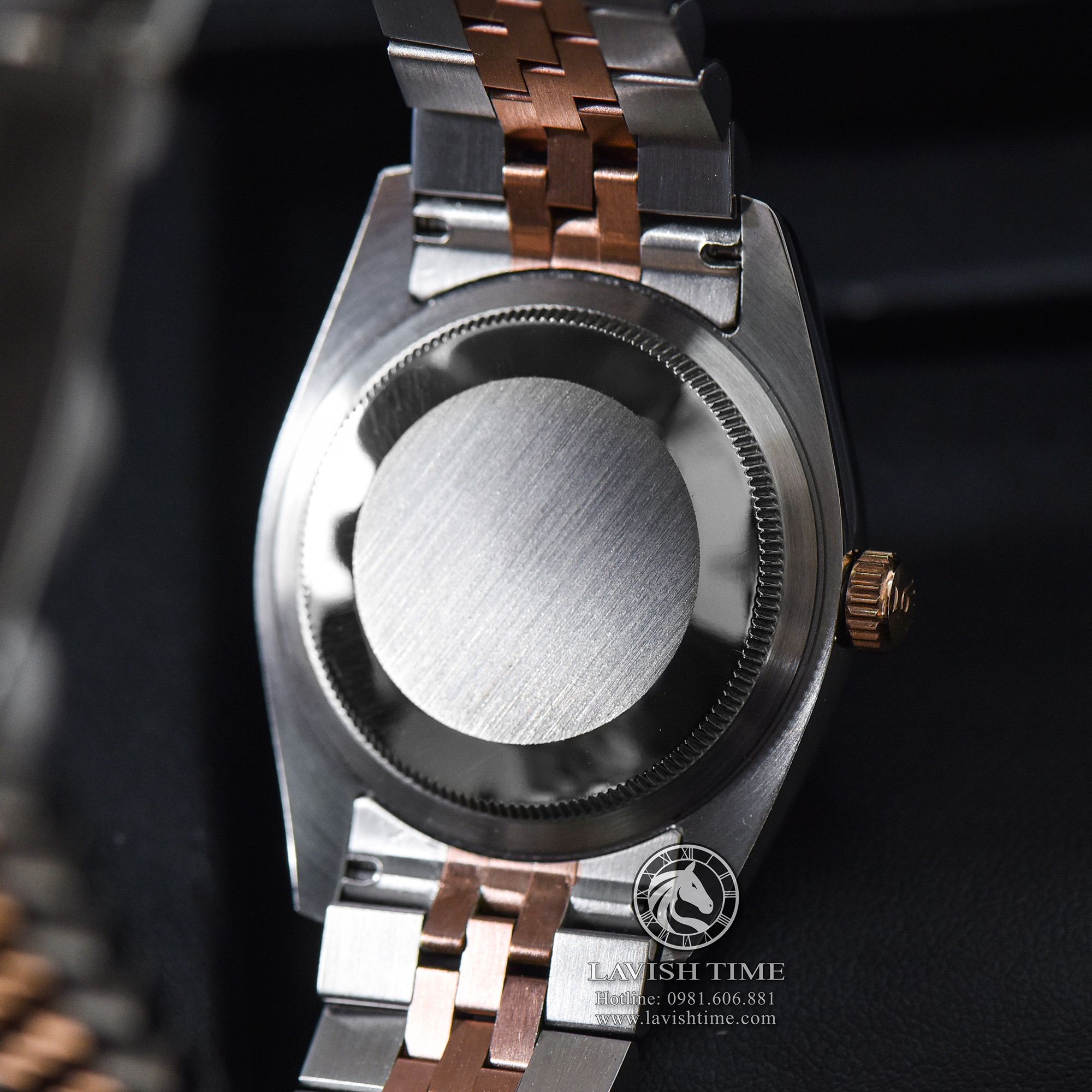 Vành bezel vàng hồng đóng một vai trò quan trọng, đóng góp cho vẻ đẹp của mặt số. Bộ phận này sẽ hắt một chút tông màu hồng ấm nóng, làm cho mặt số trở nên có sức sống hơn, đẹp mắt hơn. Đặc biệt, chiếc đồng hồ này còn đính thêm 10 viên đá Swarovski được bao bọc trong lớp thép không gỉ 316L mạ PVD vàng hồng thay cho các cọc số. Và tất nhiên, ta không thể bỏ qua được ô cửa sổ lịch ngày quen thuộc, vốn là niềm tự hào bởi Rolex. Ô cửa báo ngày ở vị trí 3 giờ - đặc trưng truyền thống của bộ sưu tập Rolex Datejust huyền thoại được trang bị ống kính Cyclops phóng đại chữ số hiệu quả.