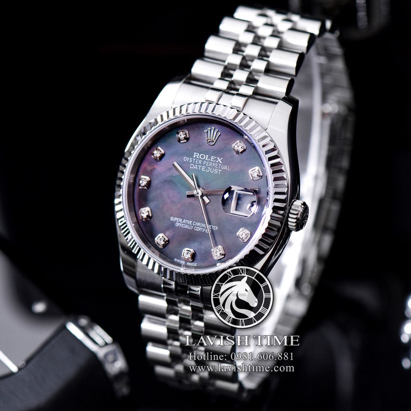 Đồng Hồ Rolex Datejust 36mm 116234 Rep 1:1 Chế Tác Vỏ Bạc Mặt Xà Cừ Tím Cọc Số Đính Đá Dây Kim Loại Jubilee