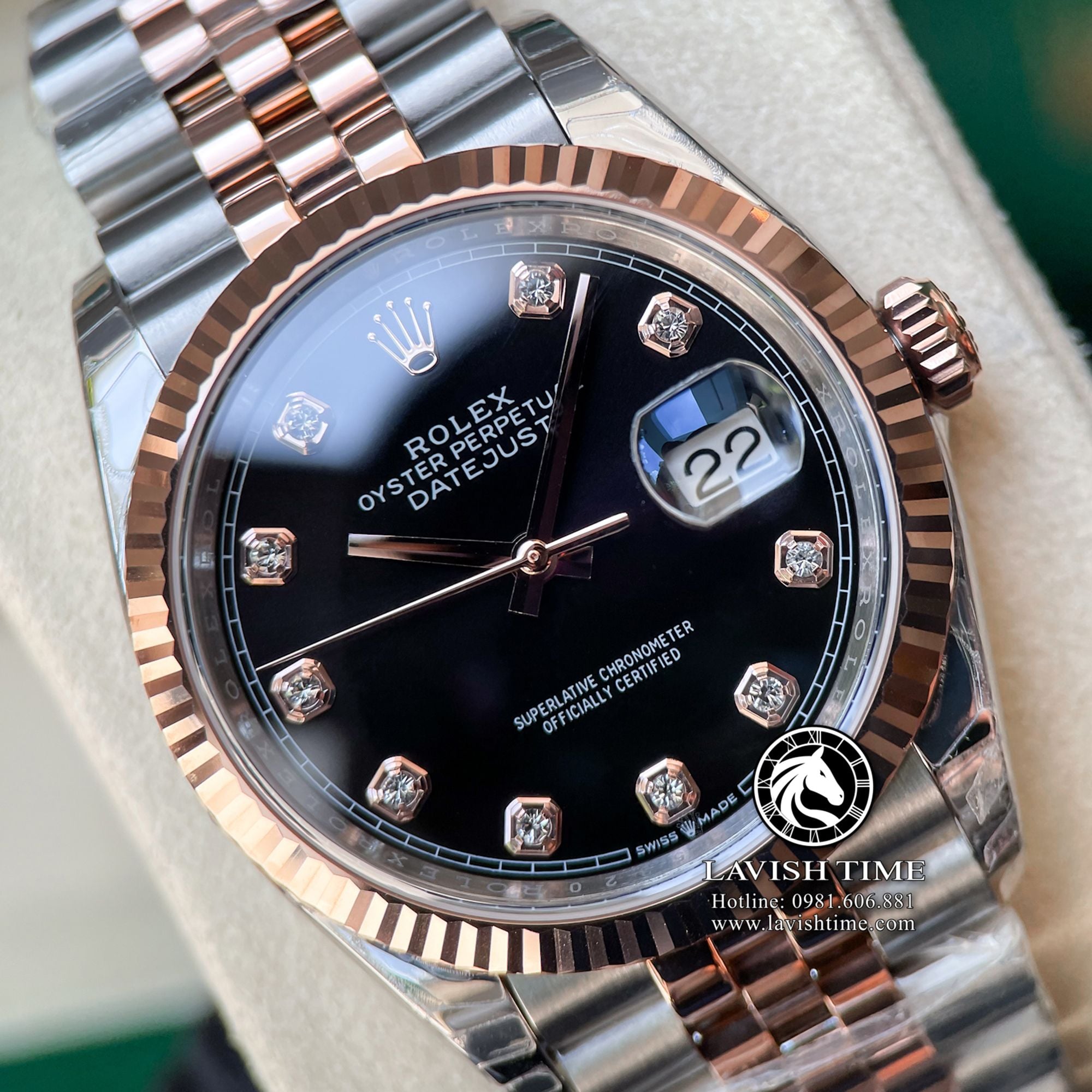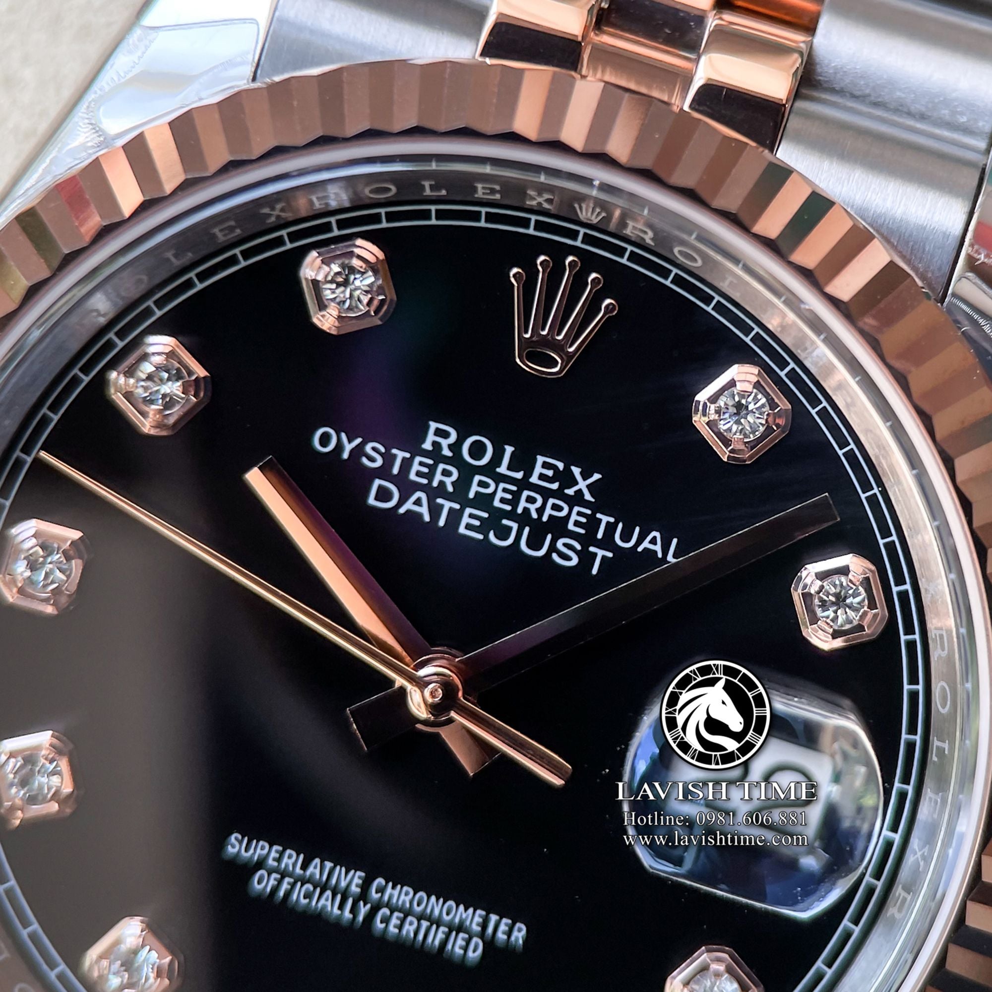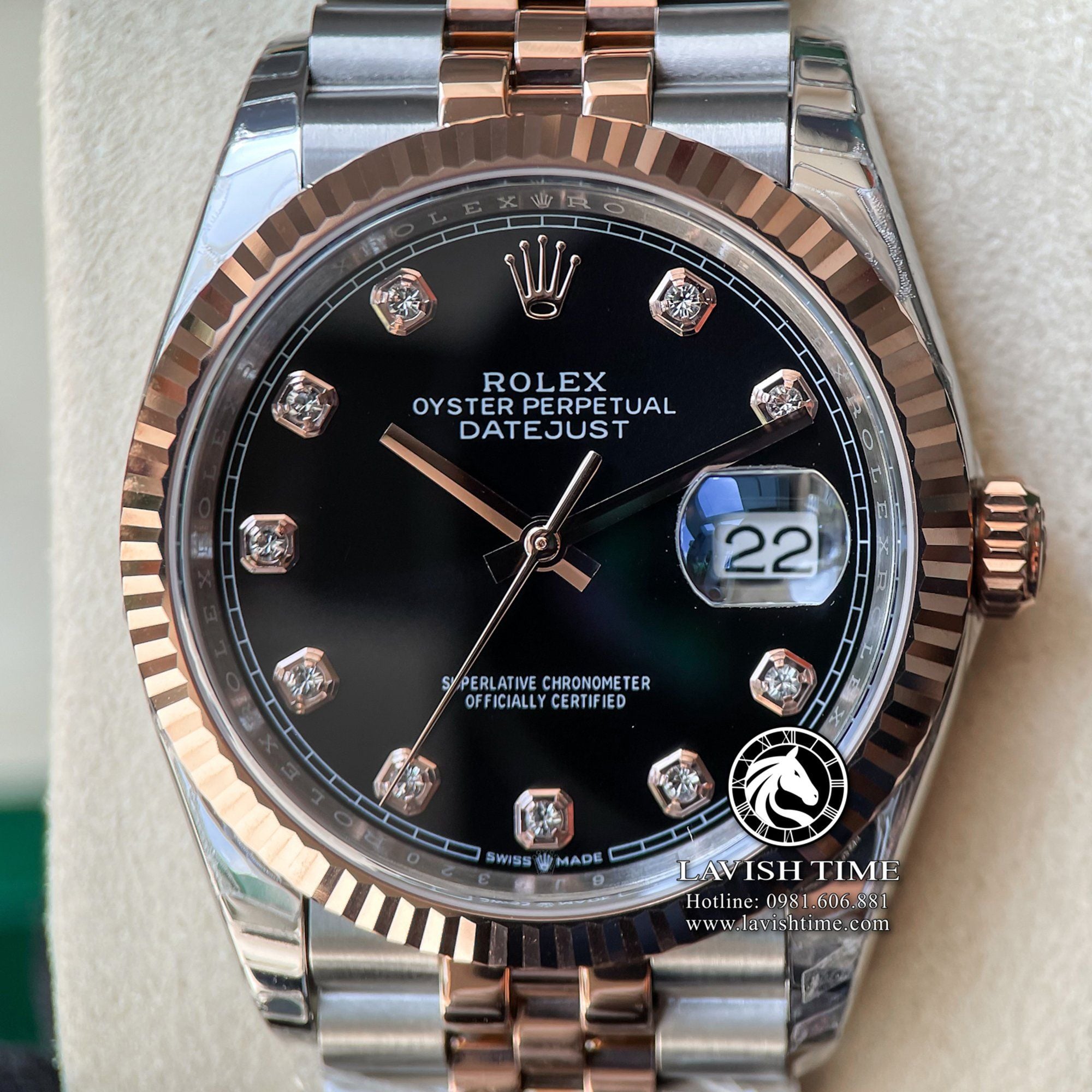 Đồng Hồ Rolex Datejust 36mm 126231-0019 Rep 1:1 Cao Cấp Vỏ Demi Vàng Hồng Mặt Đen Cọc Số Đính Đá Dây Kim Loại Julibee