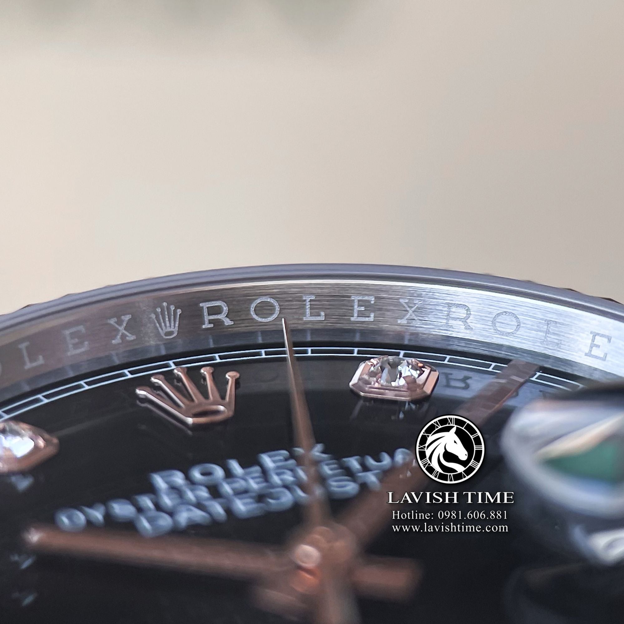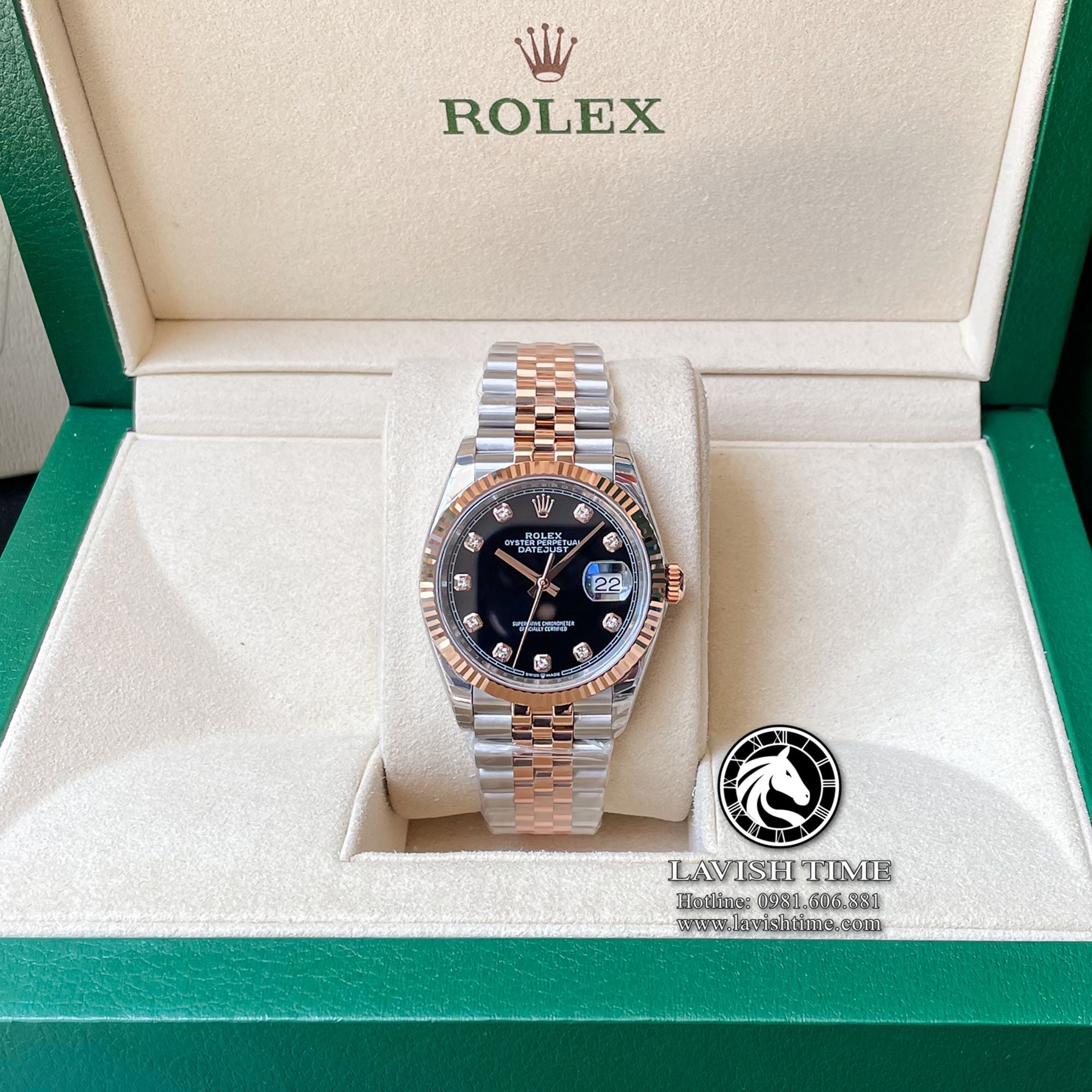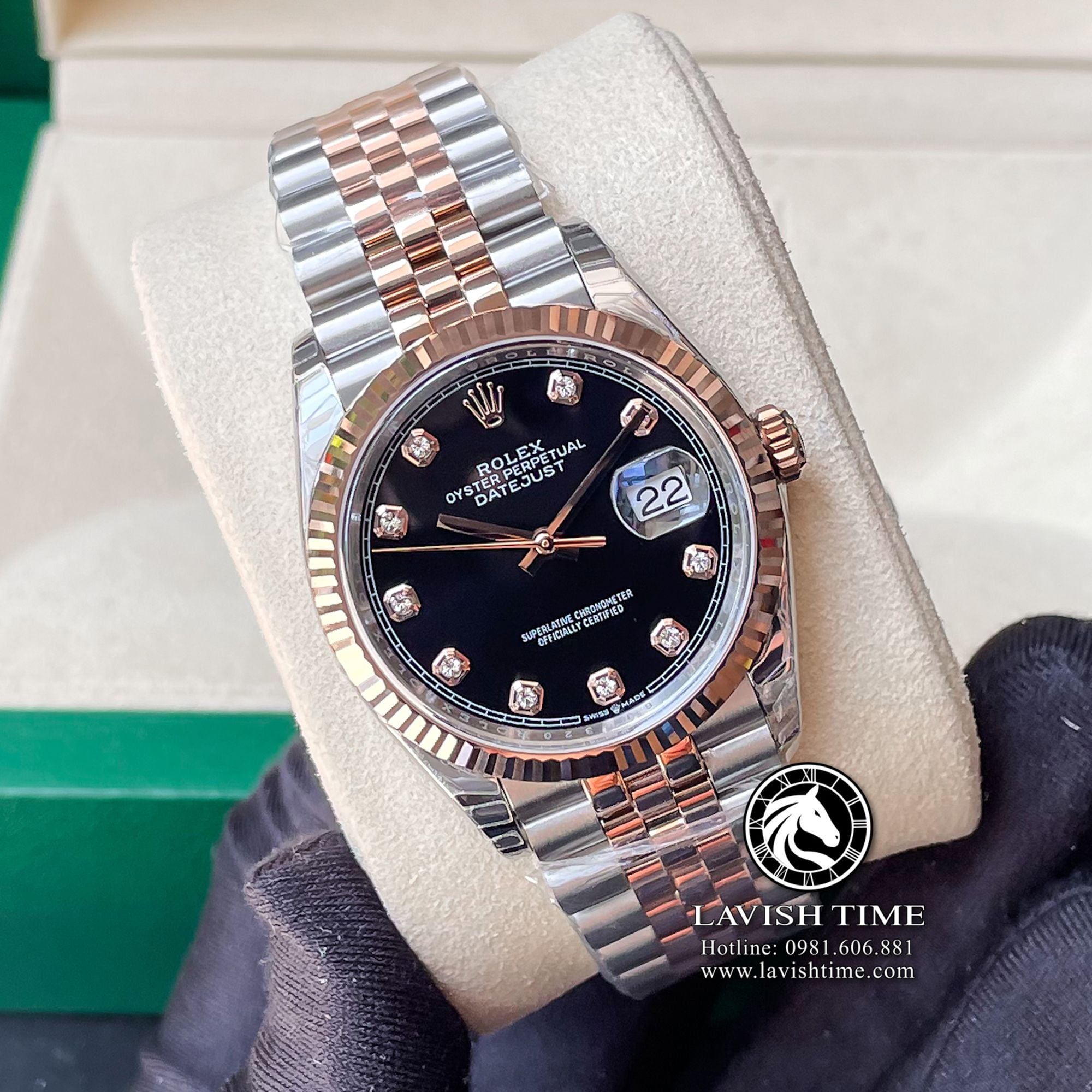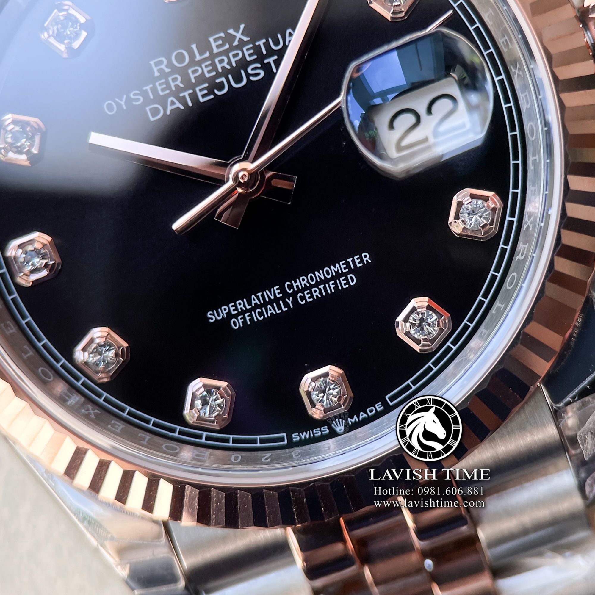 Đồng Hồ Rolex Datejust 36mm 126231-0019 Rep 1:1 Cao Cấp Vỏ Demi Vàng Hồng Mặt Đen Cọc Số Đính Đá Dây Kim Loại Julibee