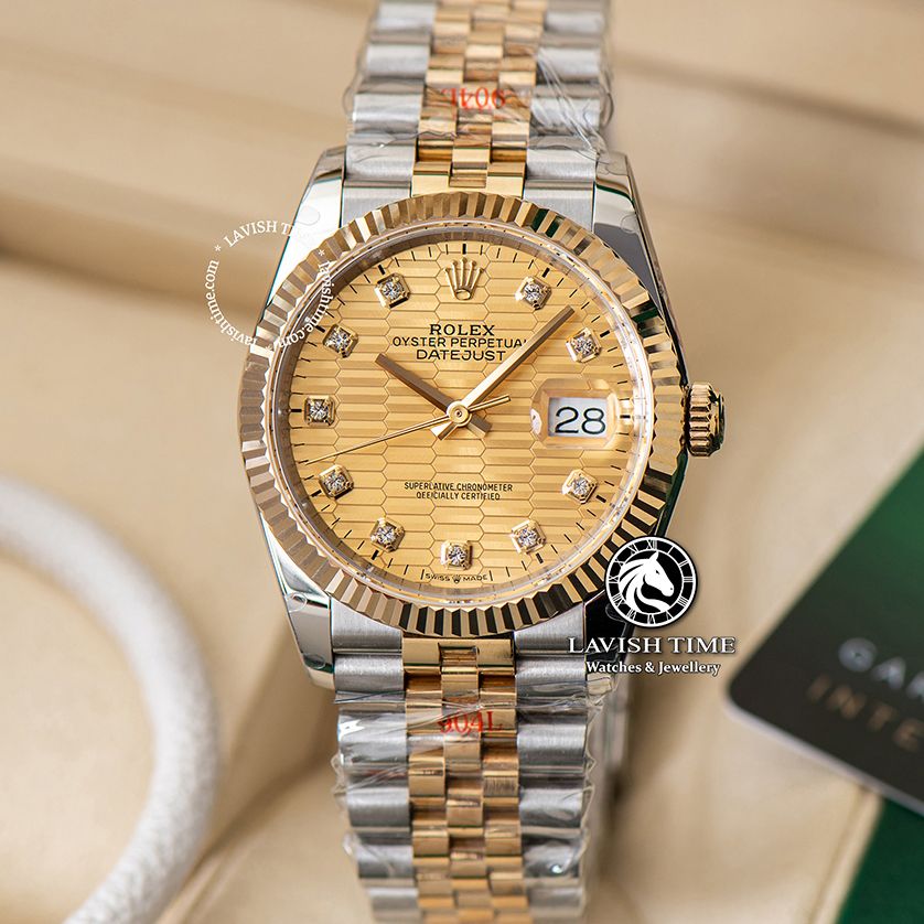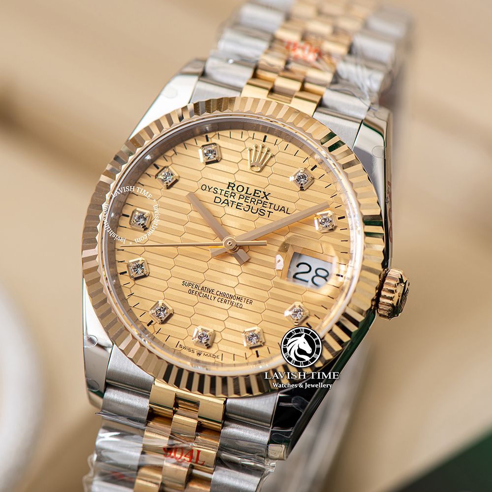Đồng Hồ Rolex Datejust 36mm 126233-0045 Rep 1:1 Chế Tác Vỏ Bọc Vàng Mặt Gấp Nếp Vàng Cọc Số Đính Đá Dây Kim Loại Jubilee