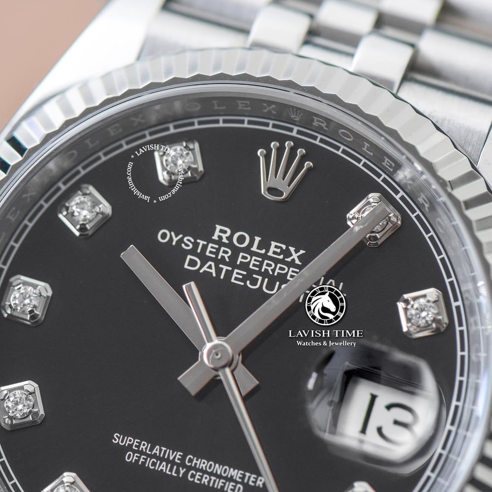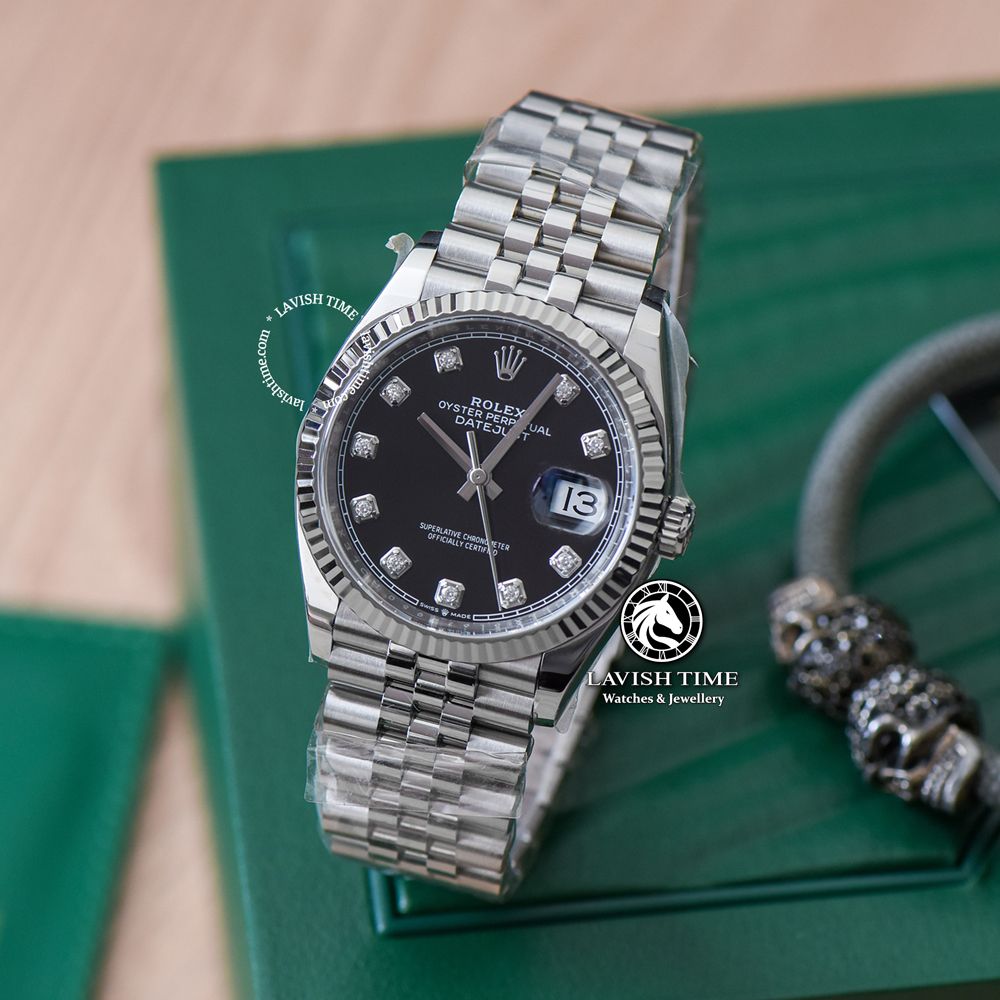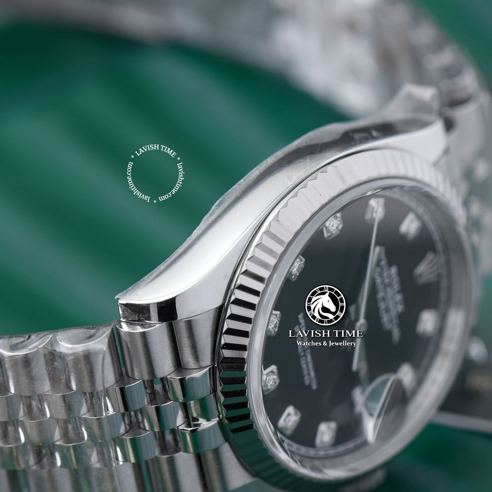 Đồng Hồ Rolex Datejust 36mm 126234-0012 Rep 1:1 Chế Tác Vỏ Bạc Mặt Đen Cọc Số Đính Đá Dây Kim Loại Jubilee