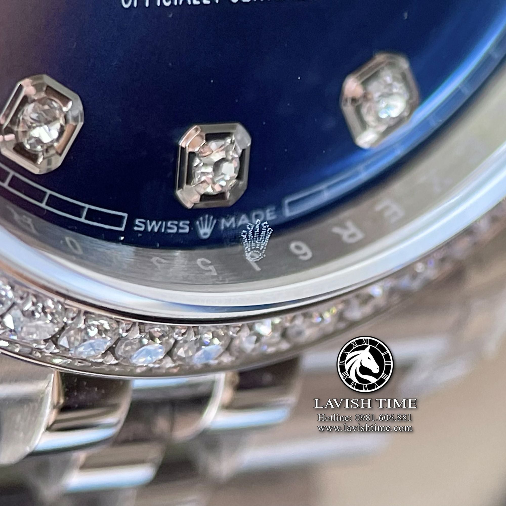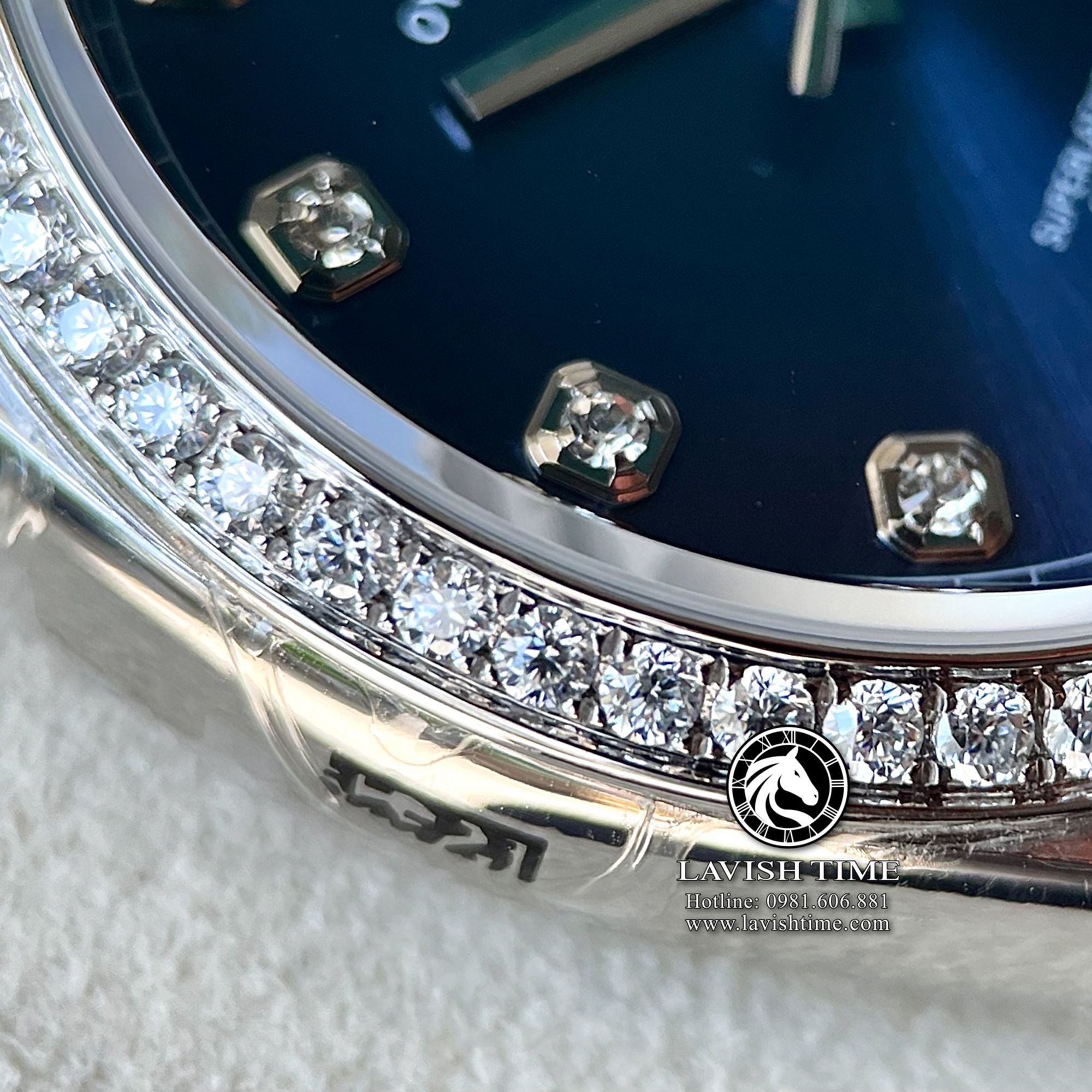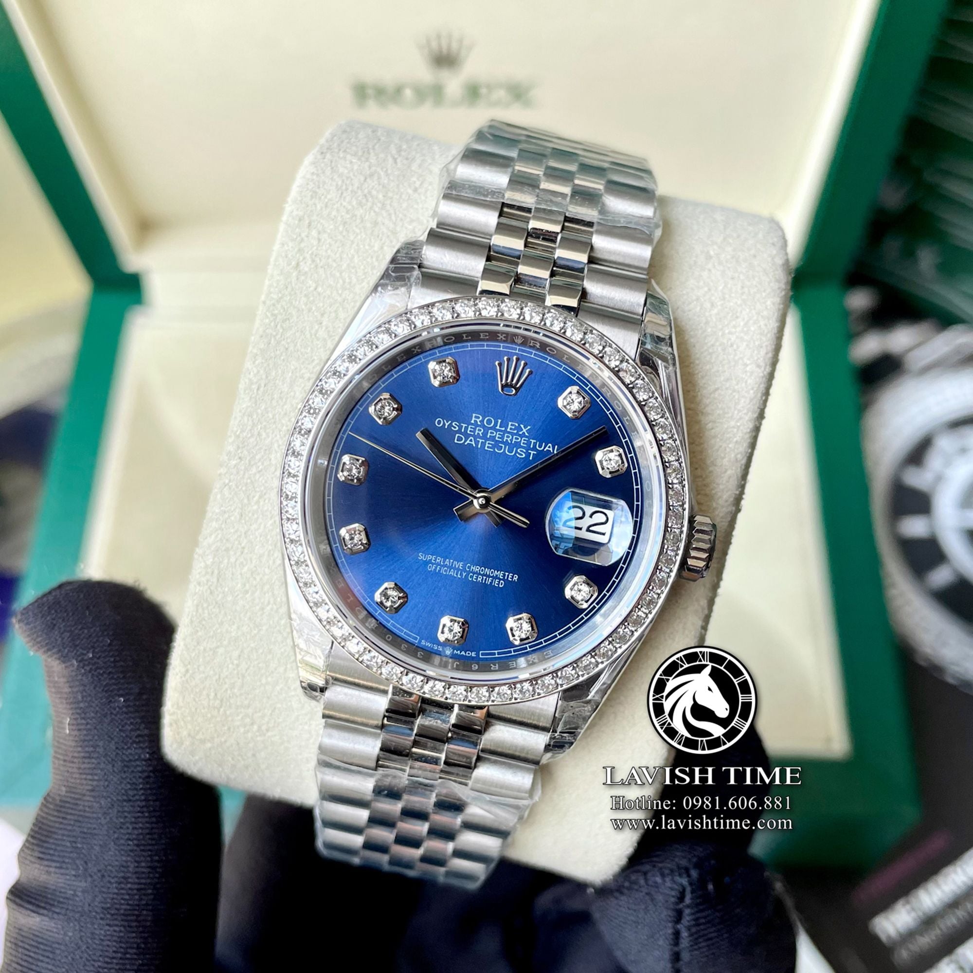 Đồng Hồ Rolex Datejust 36mm 126234-0037 Rep 1:1 Chế Tác Vỏ Bạc Viền Bezel Độ Kim Cương Thiên Nhiên - Moissanite Mặt Xanh Dương Cọc Số Đính Đá Dây Kim Loại Jubilee