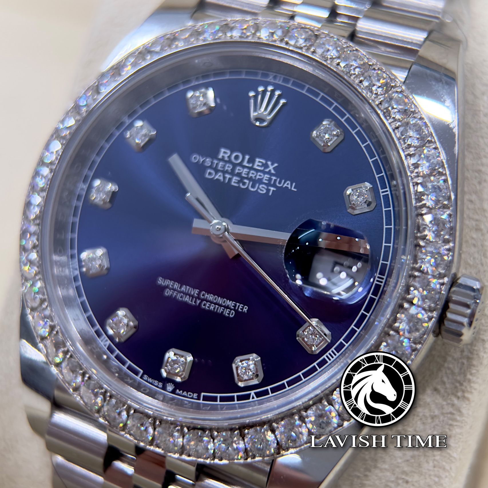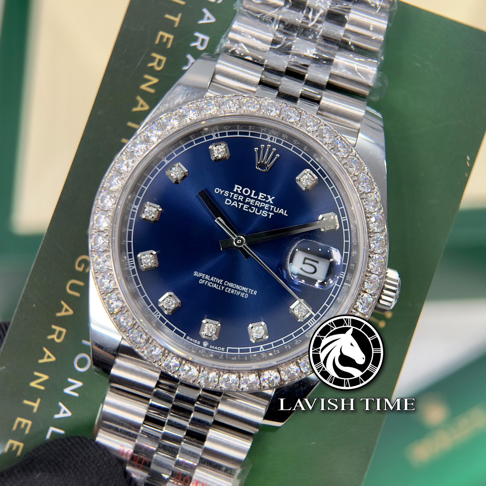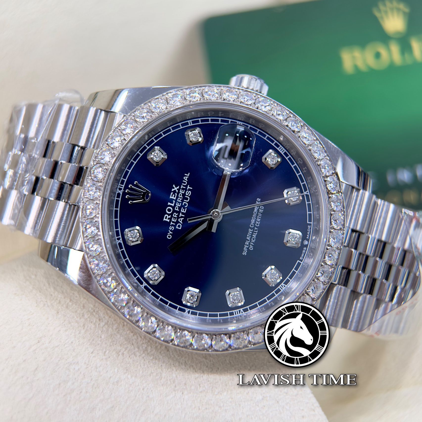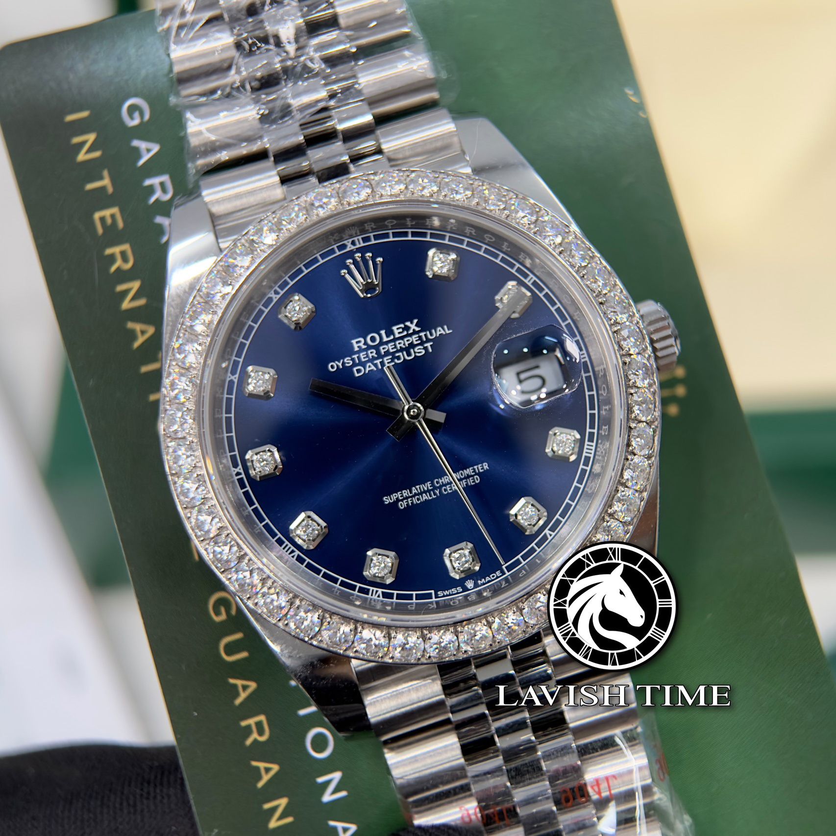 Đồng Hồ Rolex Datejust 41mm 126334-0016 Rep 1:1 Chế Tác Vỏ Bạc Niềng Bezel Và Cọc Số Độ Kim Cương Thiên Nhiên Mặt Xanh Dây Kim Loại Jubilee