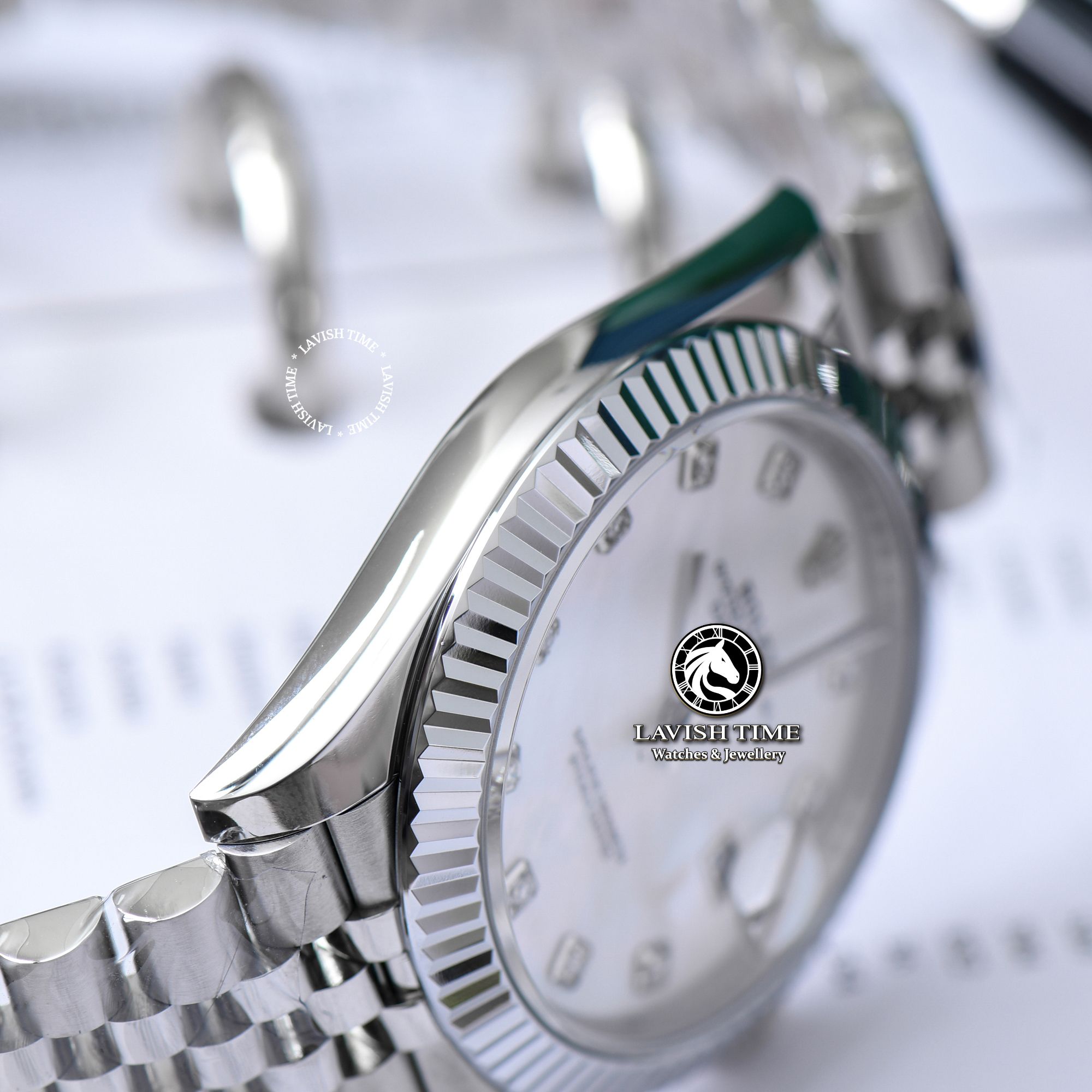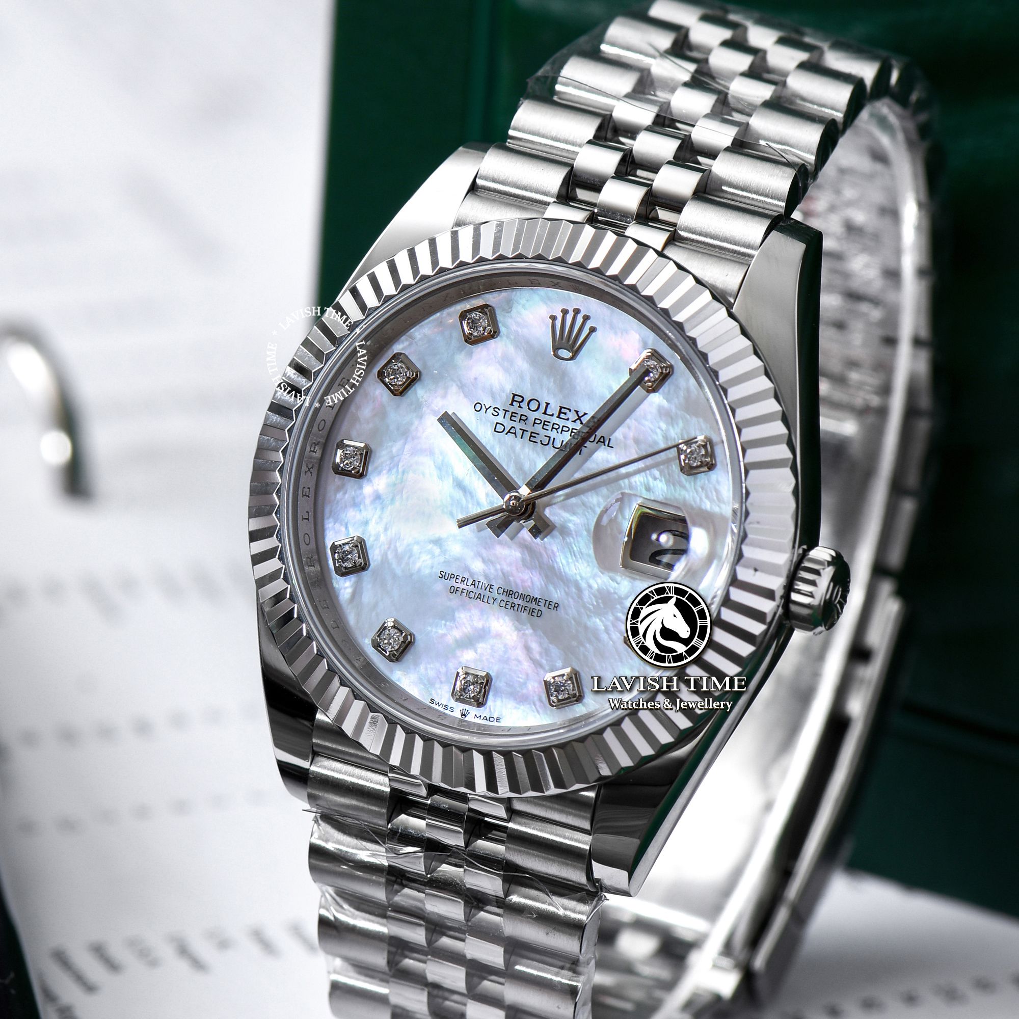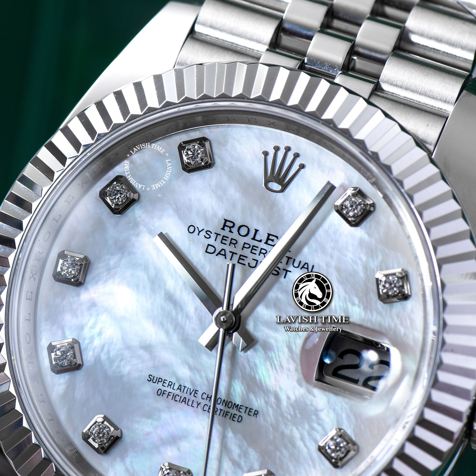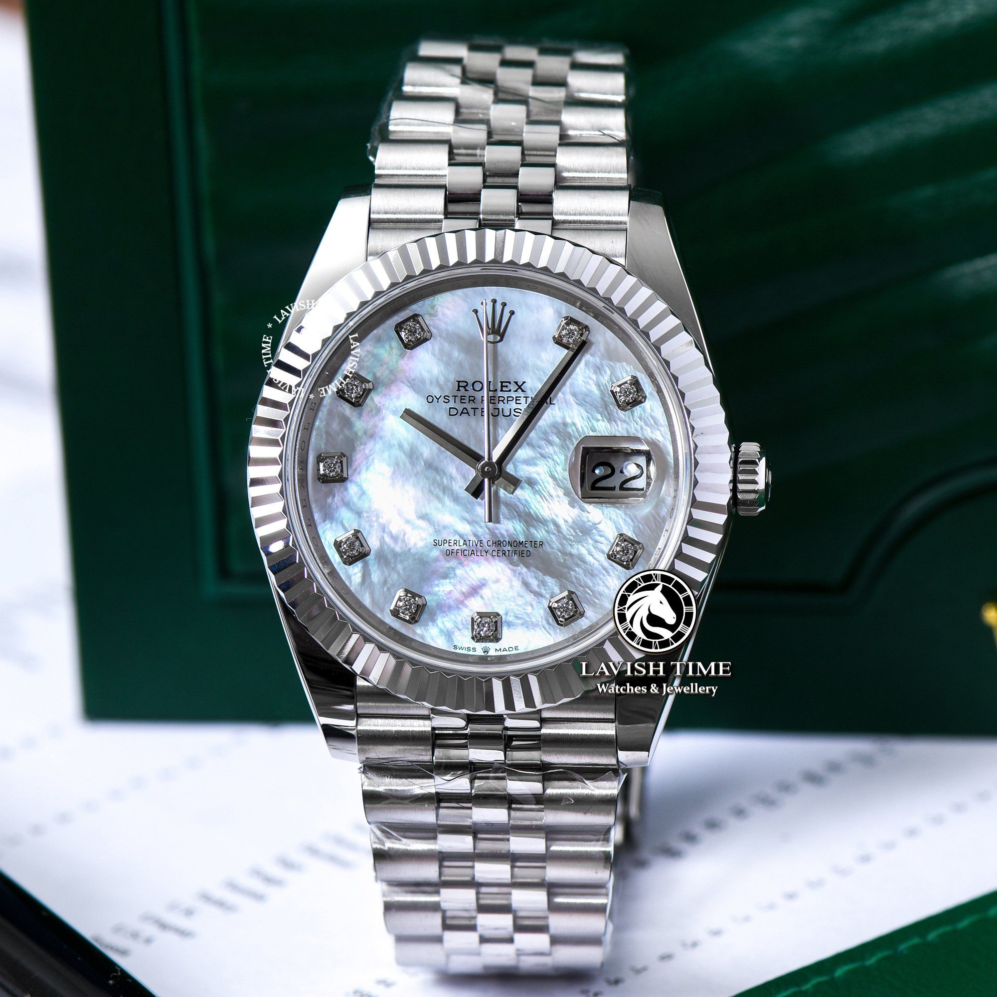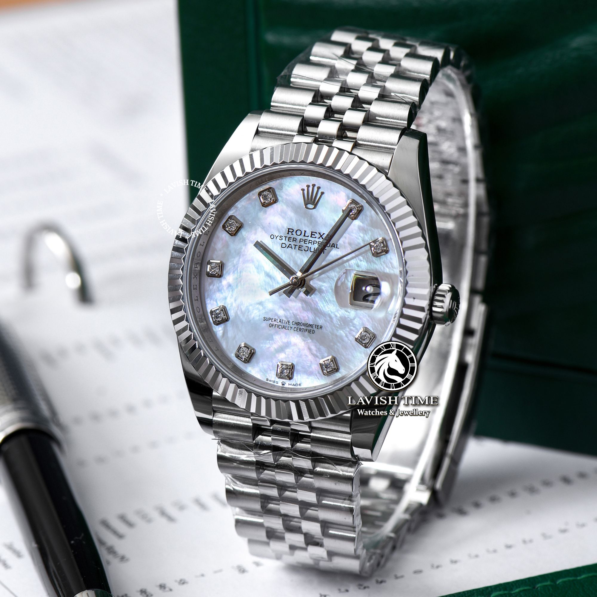| Mặt số | Mặt số xà cừ vân mây, cọc số đính đá Swarovski. |