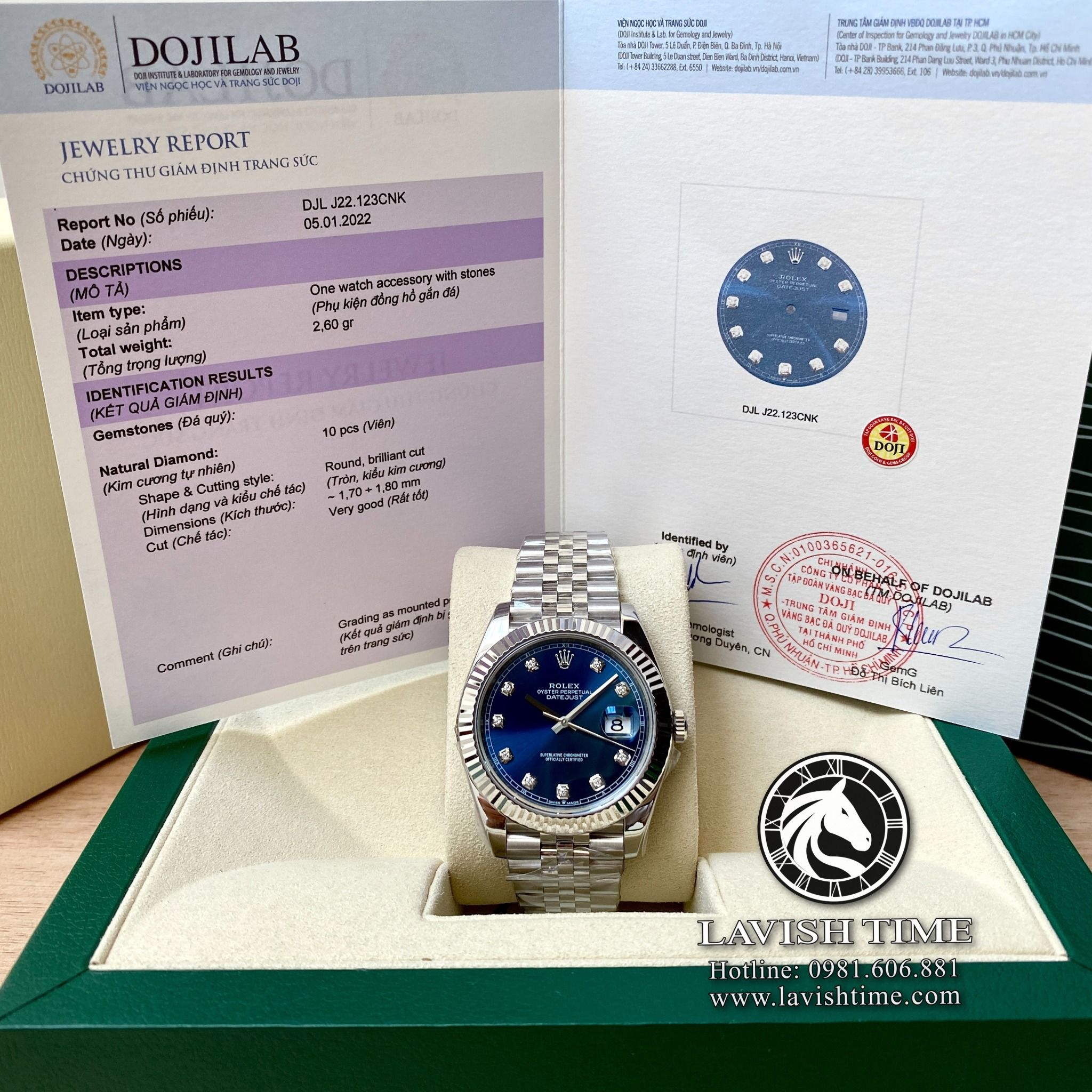 | Mặt số | Lên cọc số kim cương thiên nhiên 10 viên 1.5 ly và chân kim vàng 18K. |