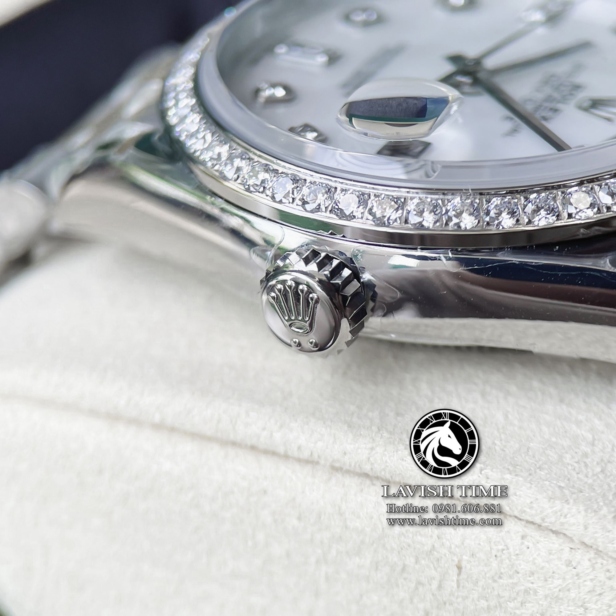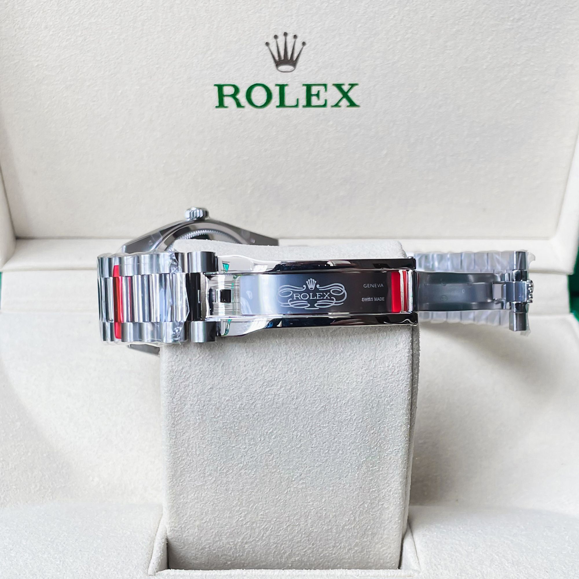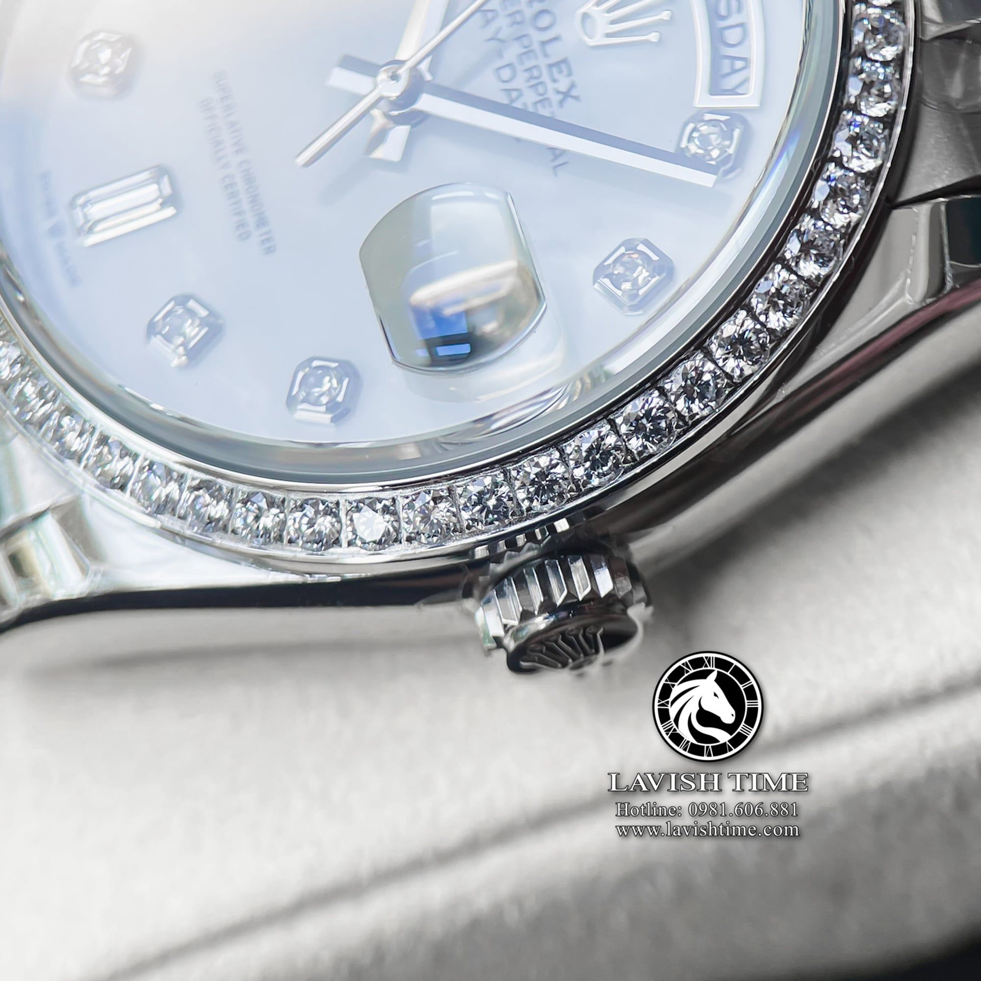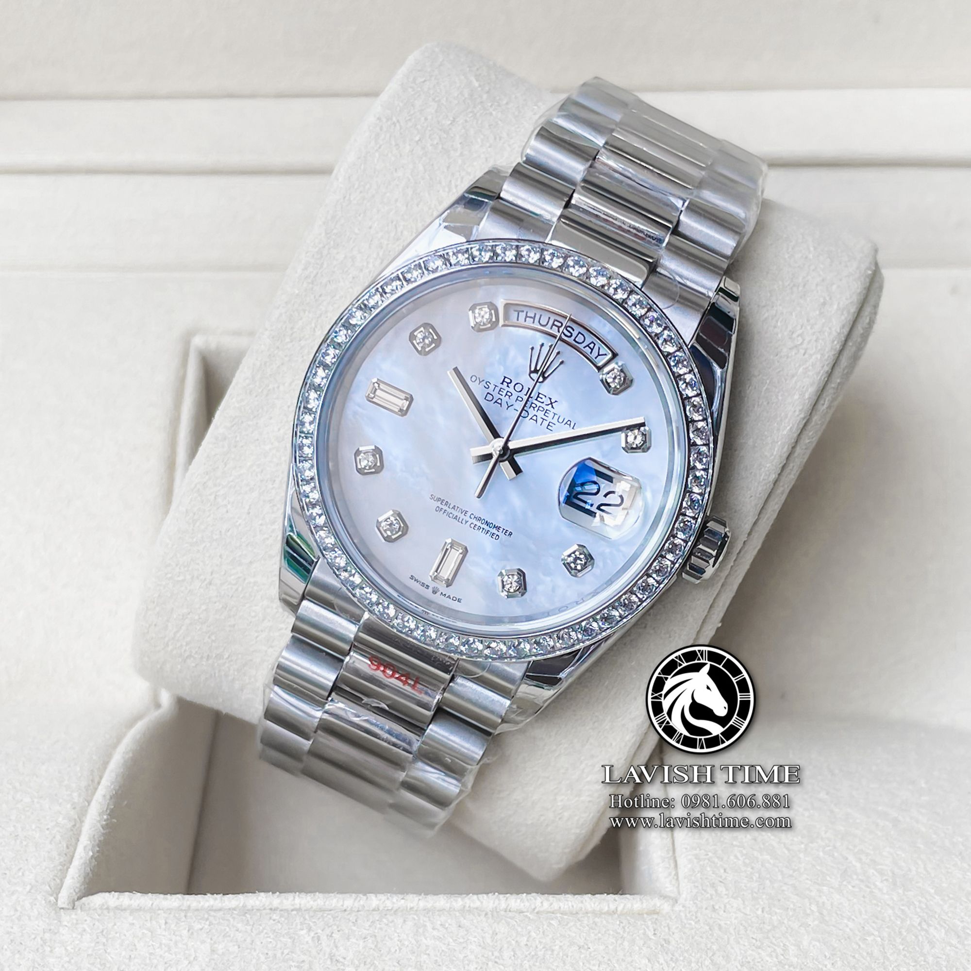 Đồng Hồ Rolex Day-Date 36mm 128349RBR-0004 Rep 1:1 Cao Cấp Vỏ Bạc Mặt Xà Cừ Trắng Niềng Bezel Đính Đá Dây Kim Loại
