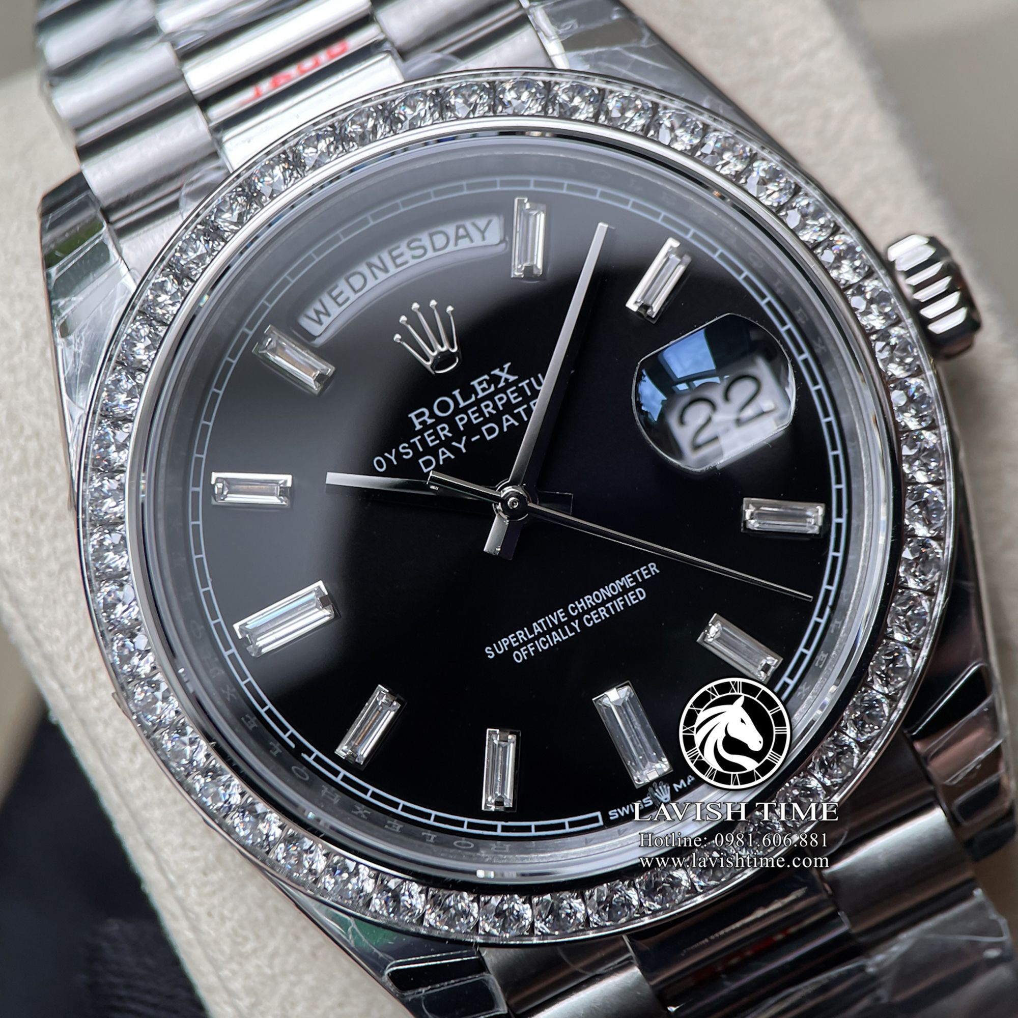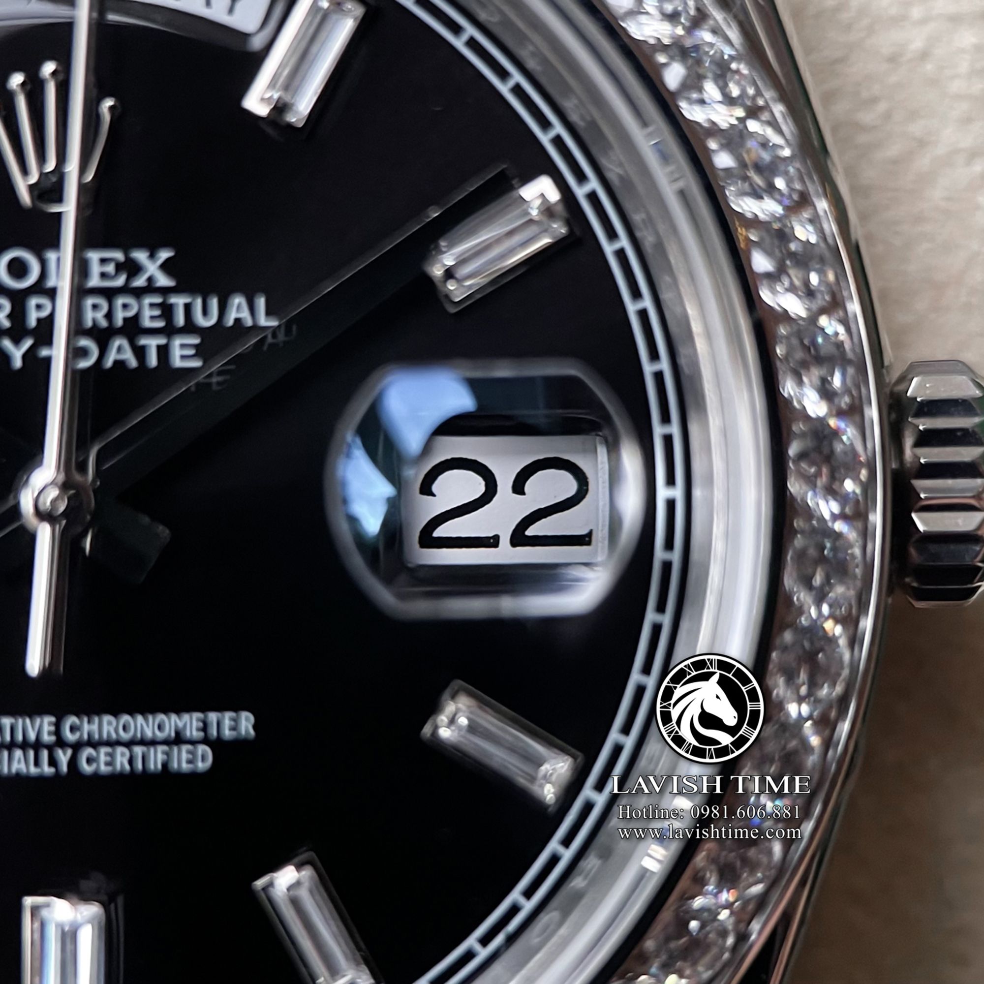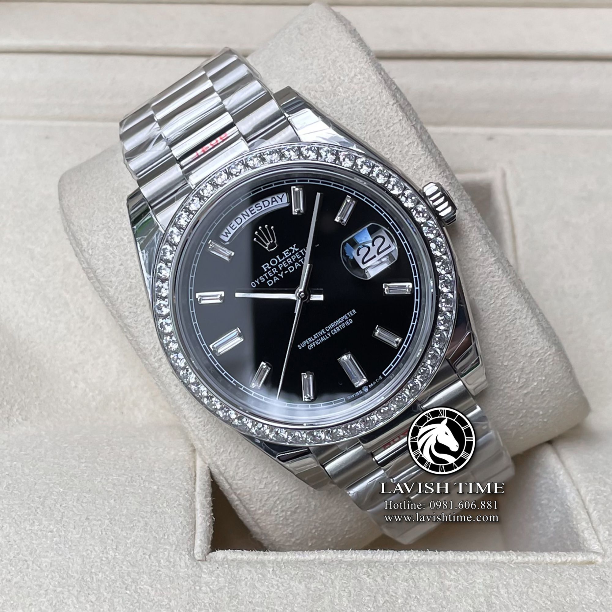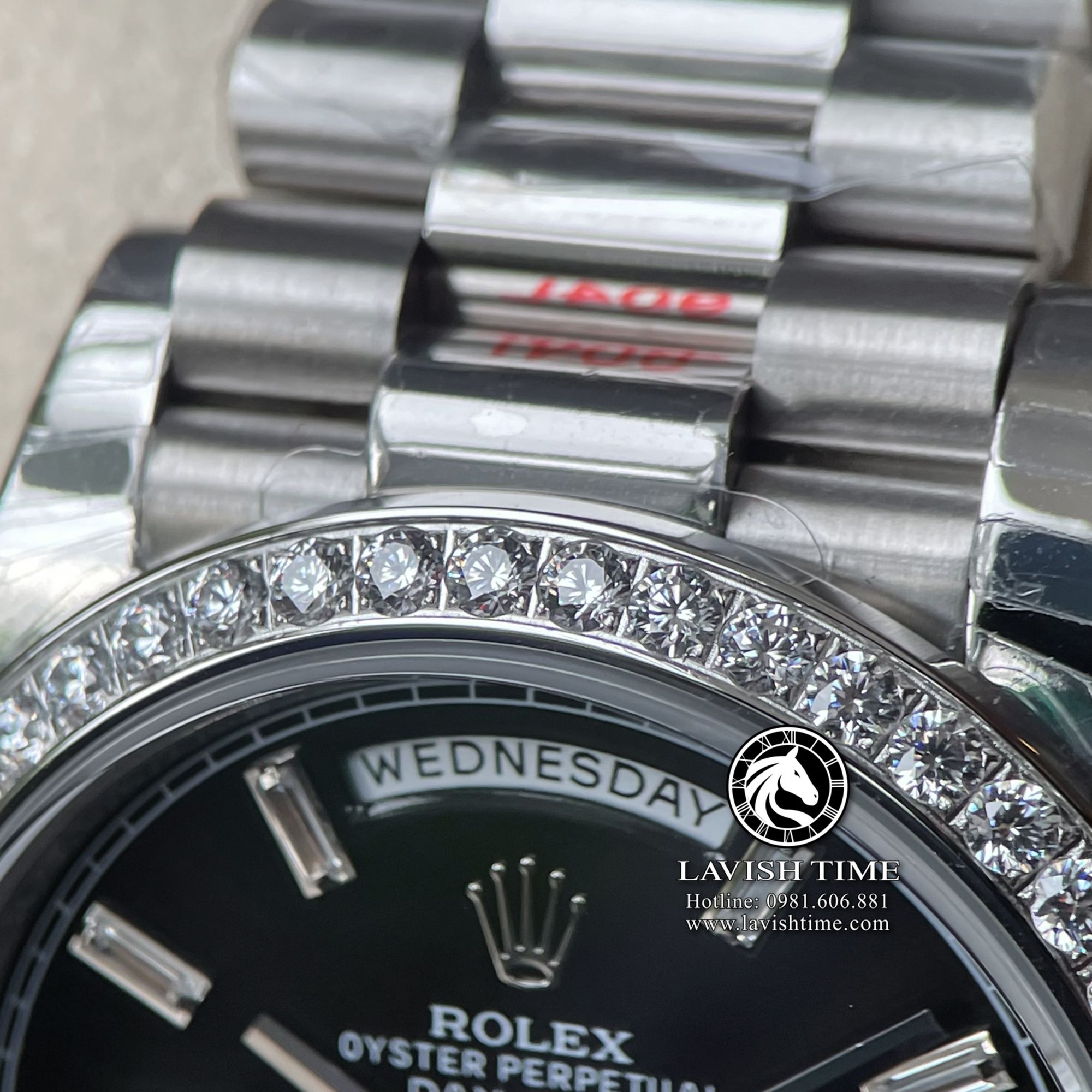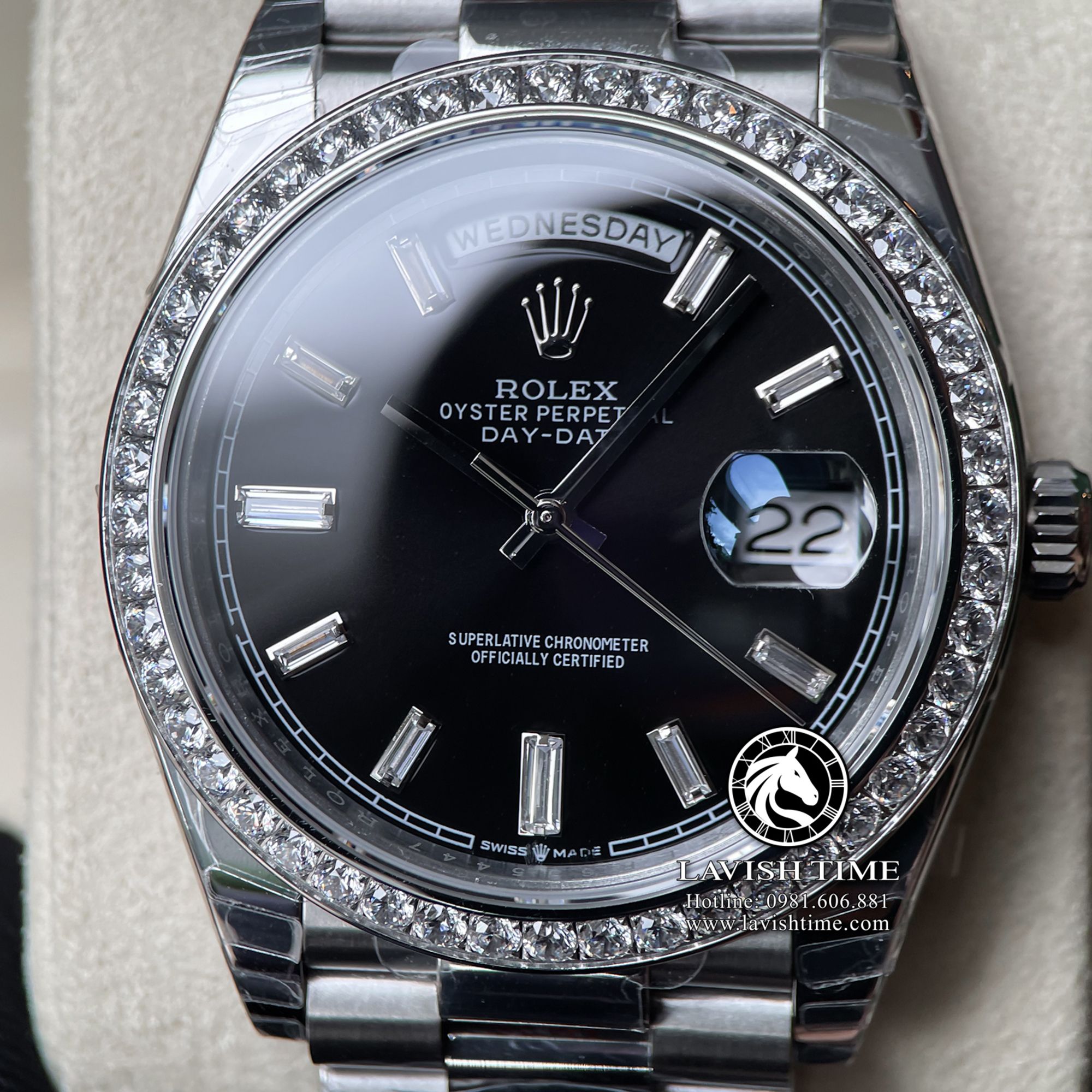 Đồng Hồ Rolex Day-Date 40mm 228349RBR Rep 1:1 Cao Cấp Vỏ Bạc Niềng Bezel Đính Đá Mặt Đen Cọc Số Đính Đá Baguette Dây Kim Loại