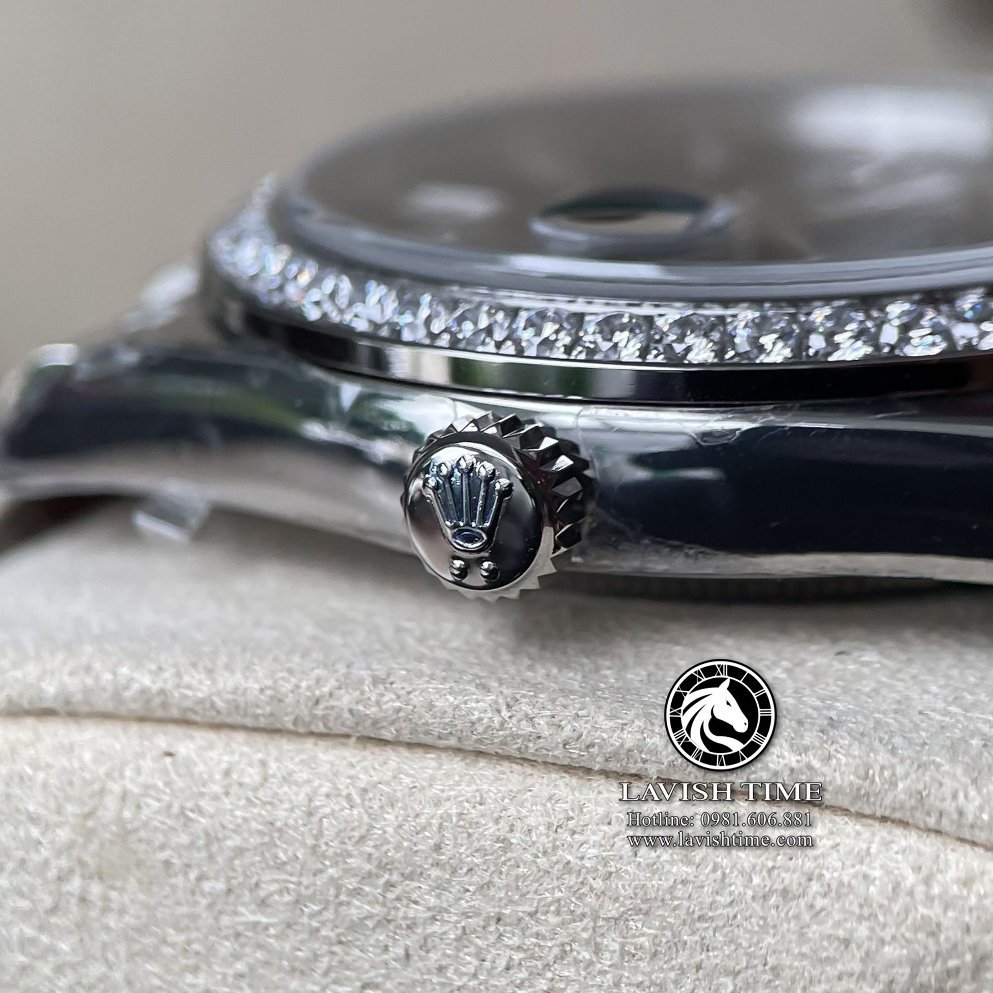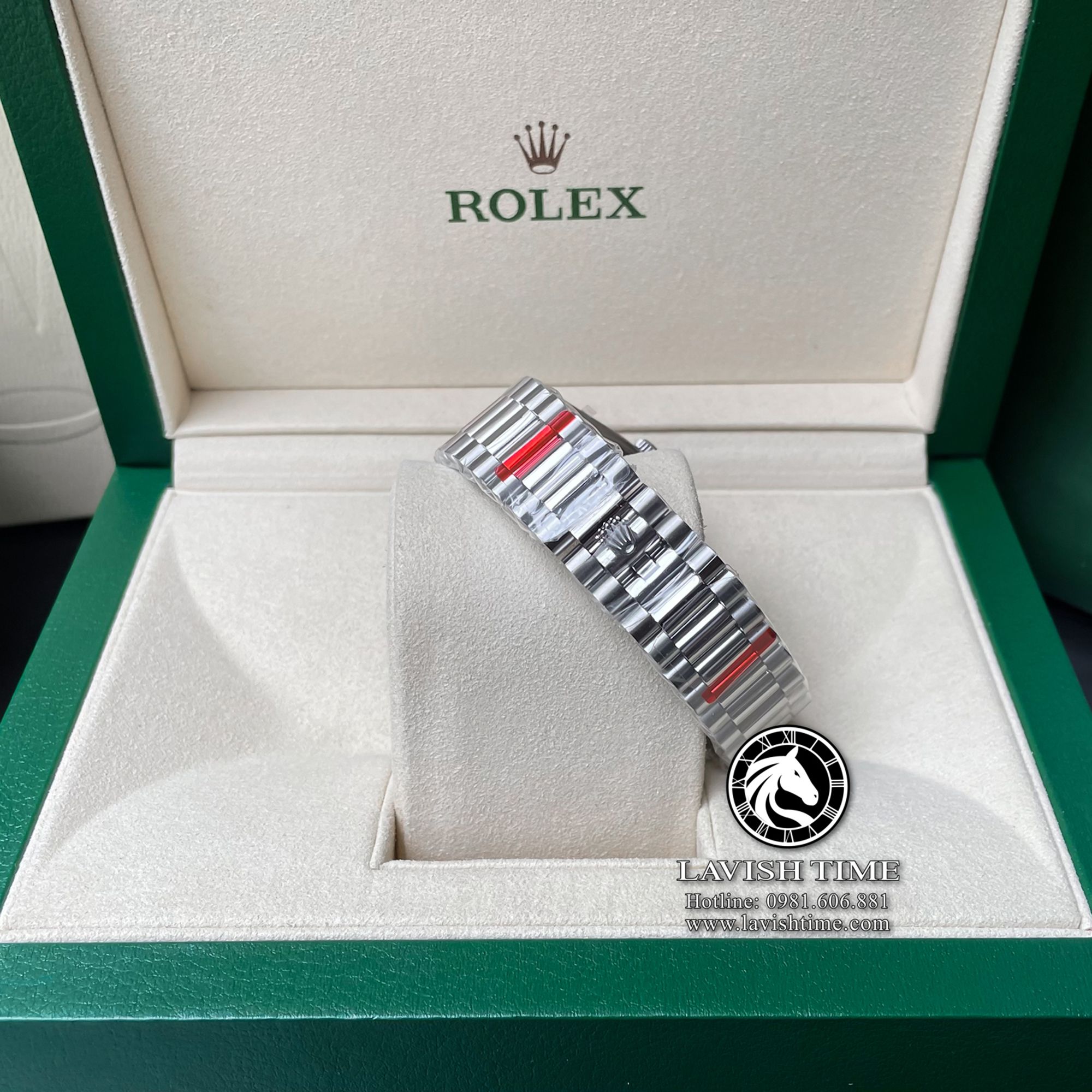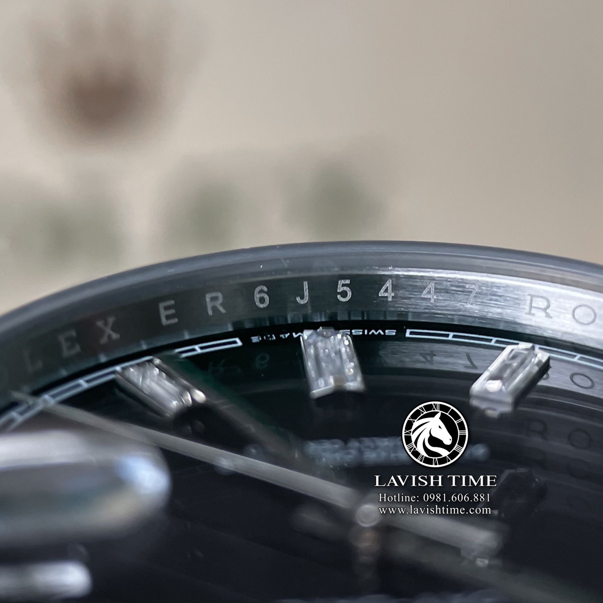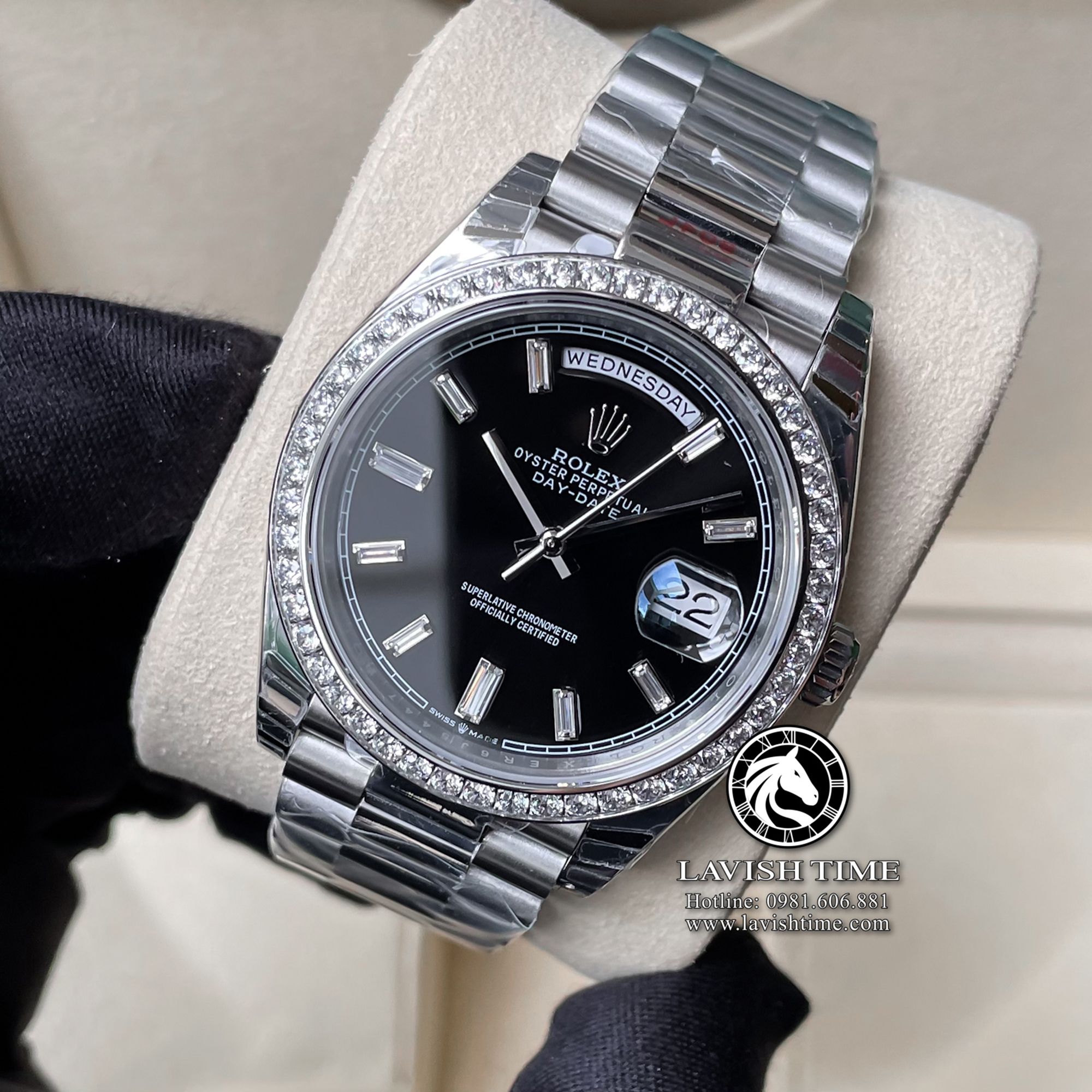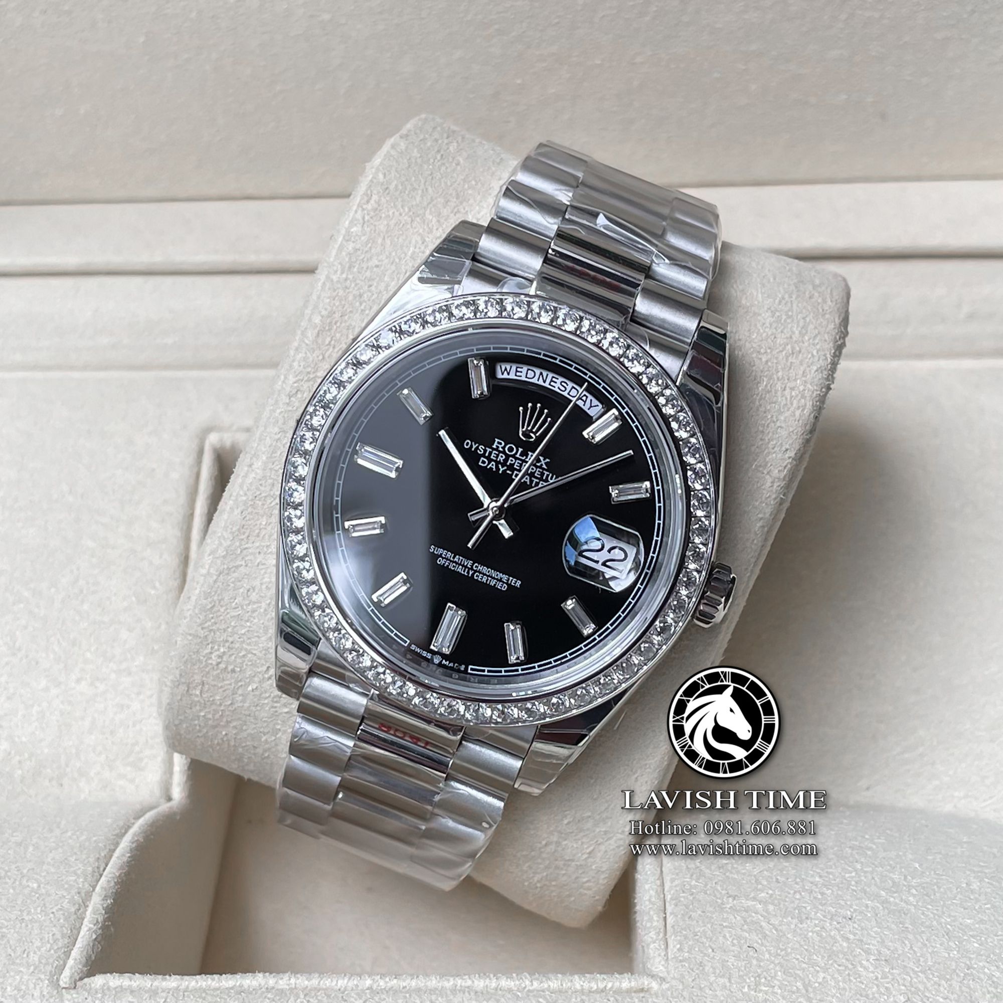 Đồng Hồ Rolex Day-Date 40mm 228349RBR Rep 1:1 Cao Cấp Vỏ Bạc Niềng Bezel Đính Đá Mặt Đen Cọc Số Đính Đá Baguette Dây Kim Loại