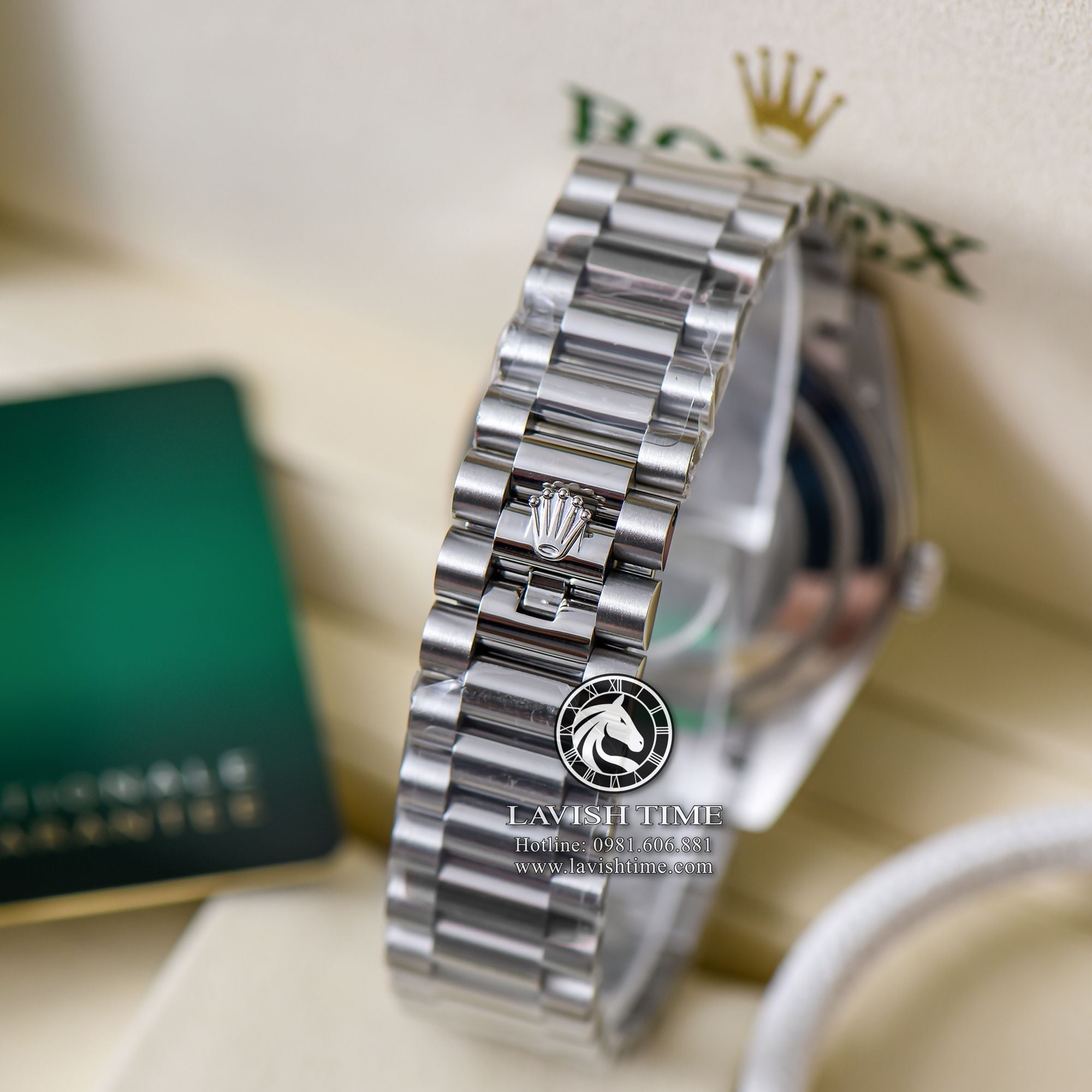 Đồng Hồ Rolex Day-Date 40mm 228396TBR-0002 Rep 1:1 Cao Cấp Vỏ Bạc Niềng Bezel Đính Đá Baugette Mặt Xanh Bằng Cọc Số Đính Đá Baguette Dây Kim Loại