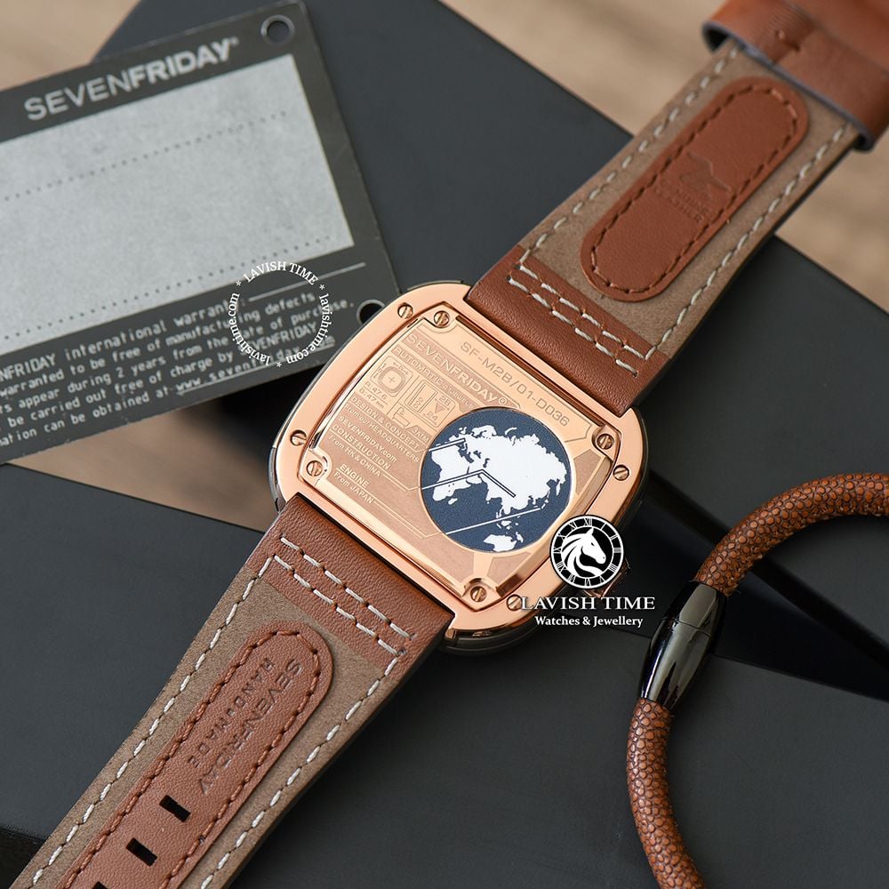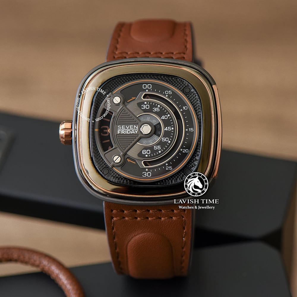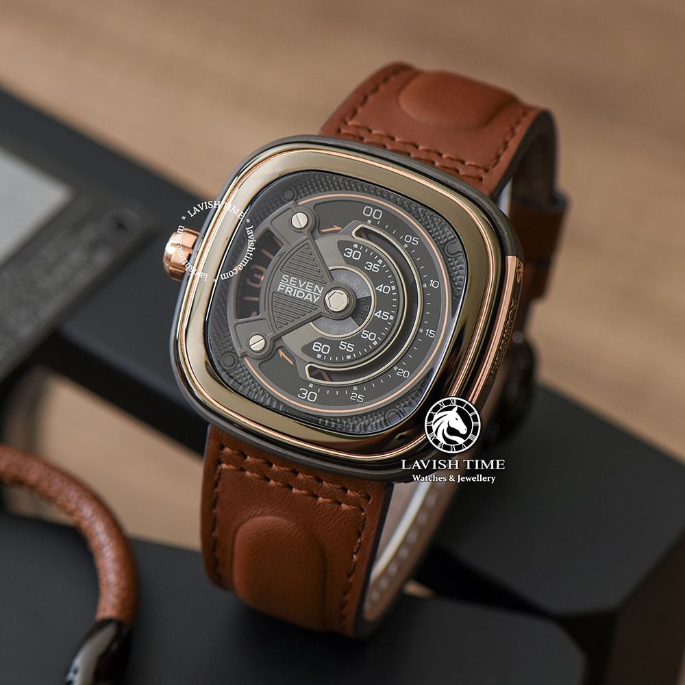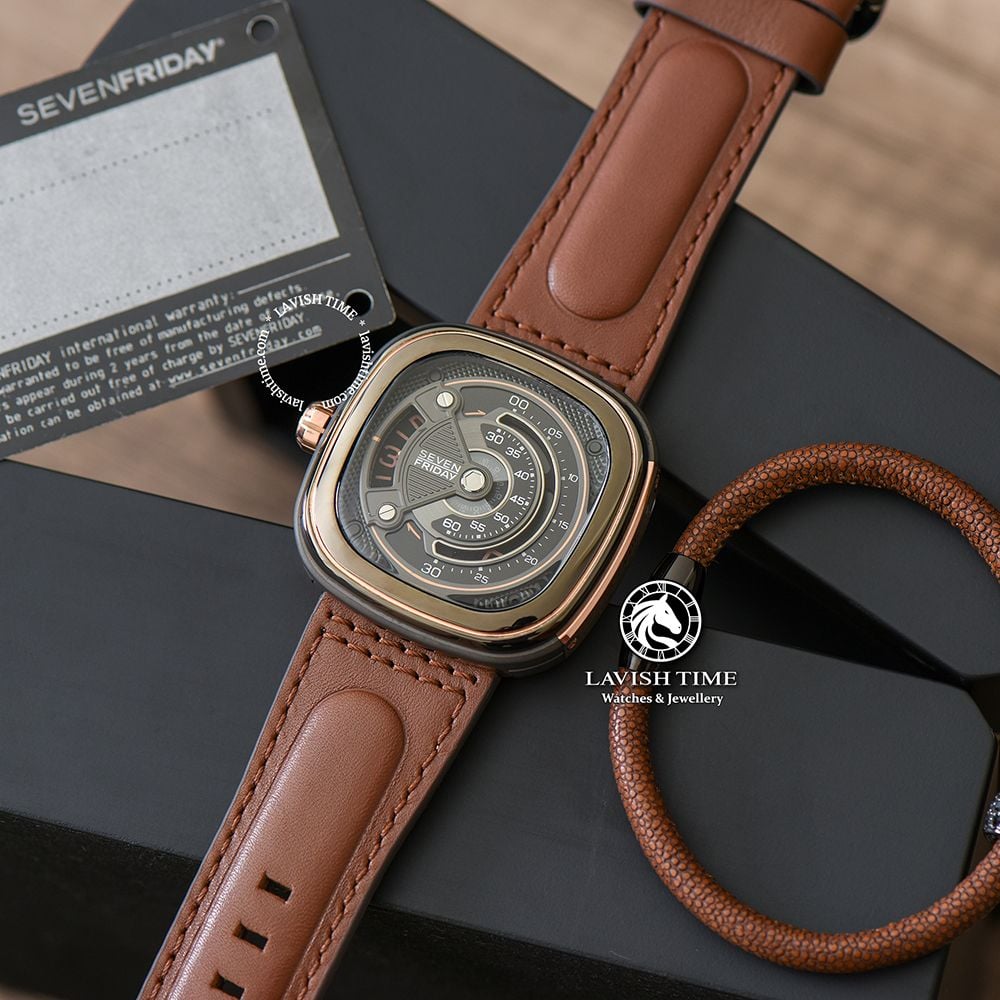 Phiên bản M2B/01 gây “thương nhớ” bởi mặt số đồng hồ 7 lớp nền màu ghi nòng súng kèm các chi tiết vàng hồng nổi bật và cách phối màu nâu – vàng kinh điển. Cùng với bộ dây đeo được làm từ chất liệu da bò màu nâu, SevenFriday luôn muốn khách hàng của mình trải nghiệm được những sản phẩm đầy sáng tạo nhưng vẫn phải đem đến sự thoải mái khi đeo.