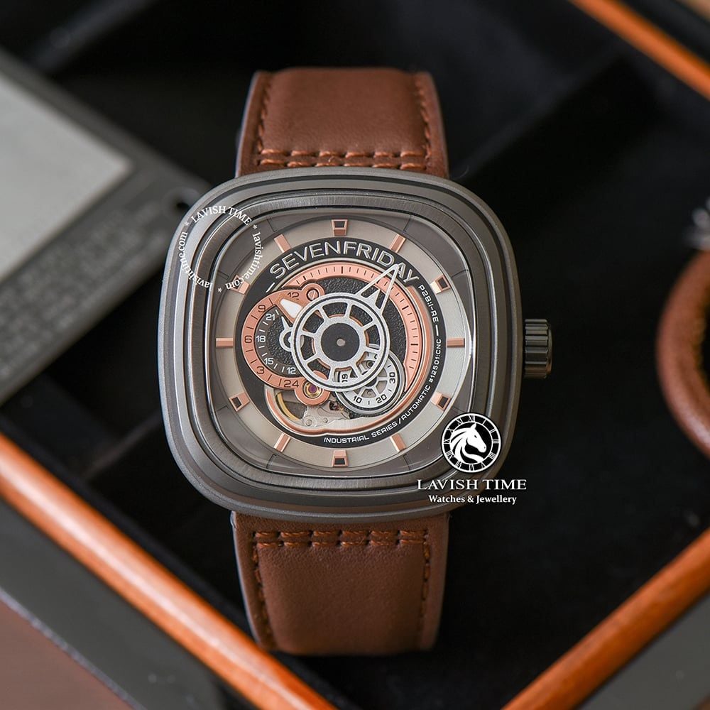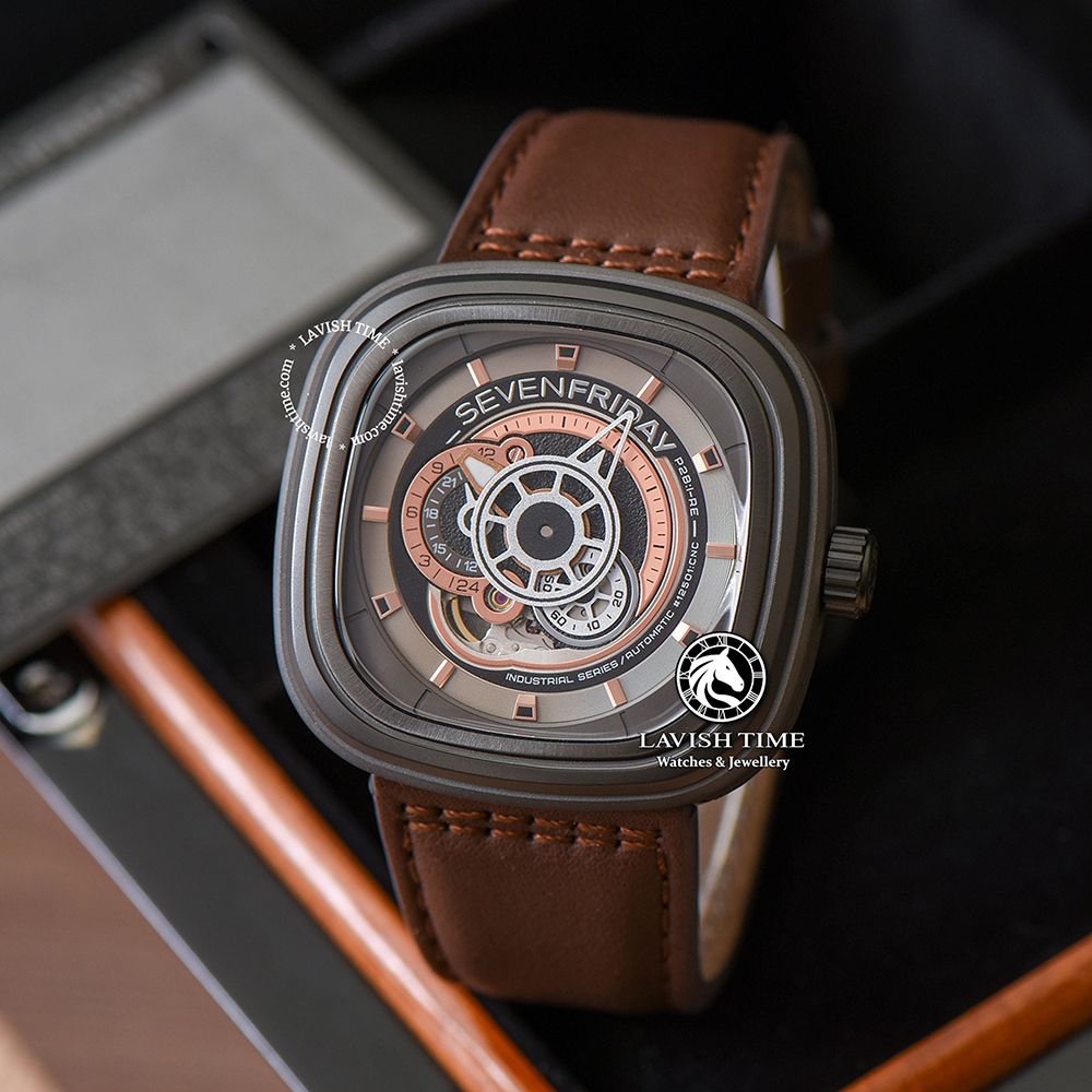 Vẫn là các tông màu chủ đạo như nâu, vàng đồng và xám, chiếc đồng hồ SevenFriday P2B/01 sở hữu những nét đặc trưng của thương hiệu 7 ngày thứ 6 với thiết kế mặt vuông oversized cùng với bộ vỏ được làm từ chất thép không gỉ phủ lớp PVD màu xám đậm, giúp làm giảm độ xước cho vỏ đồng hồ.
