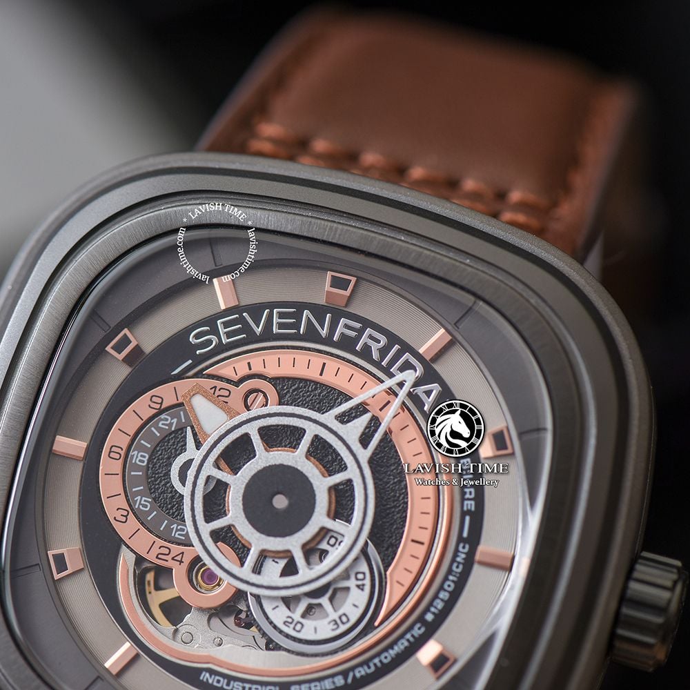 Kết hợp với vòng animation màu xám trắng nổi bật trên nền mặt số đen cùng những chi tiết màu đen và vàng hồng được kết hợp hài hòa và tinh tế, tạo vẻ đẹp cổ điển cho chiếc P2B/01. Đặc biệt ở phiên bản mới này, kim giờ được SevenFriday điểm thêm chi tiết dạ quang để tạo điểm nhấn.