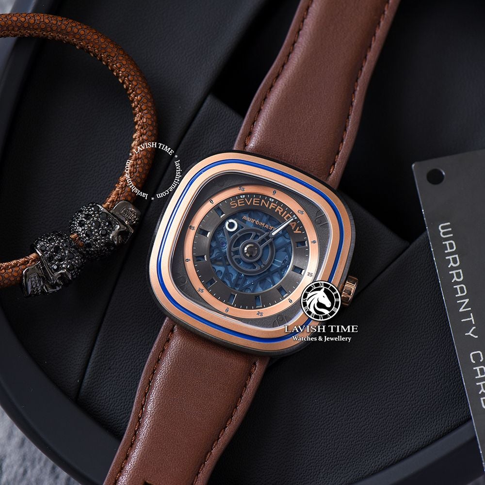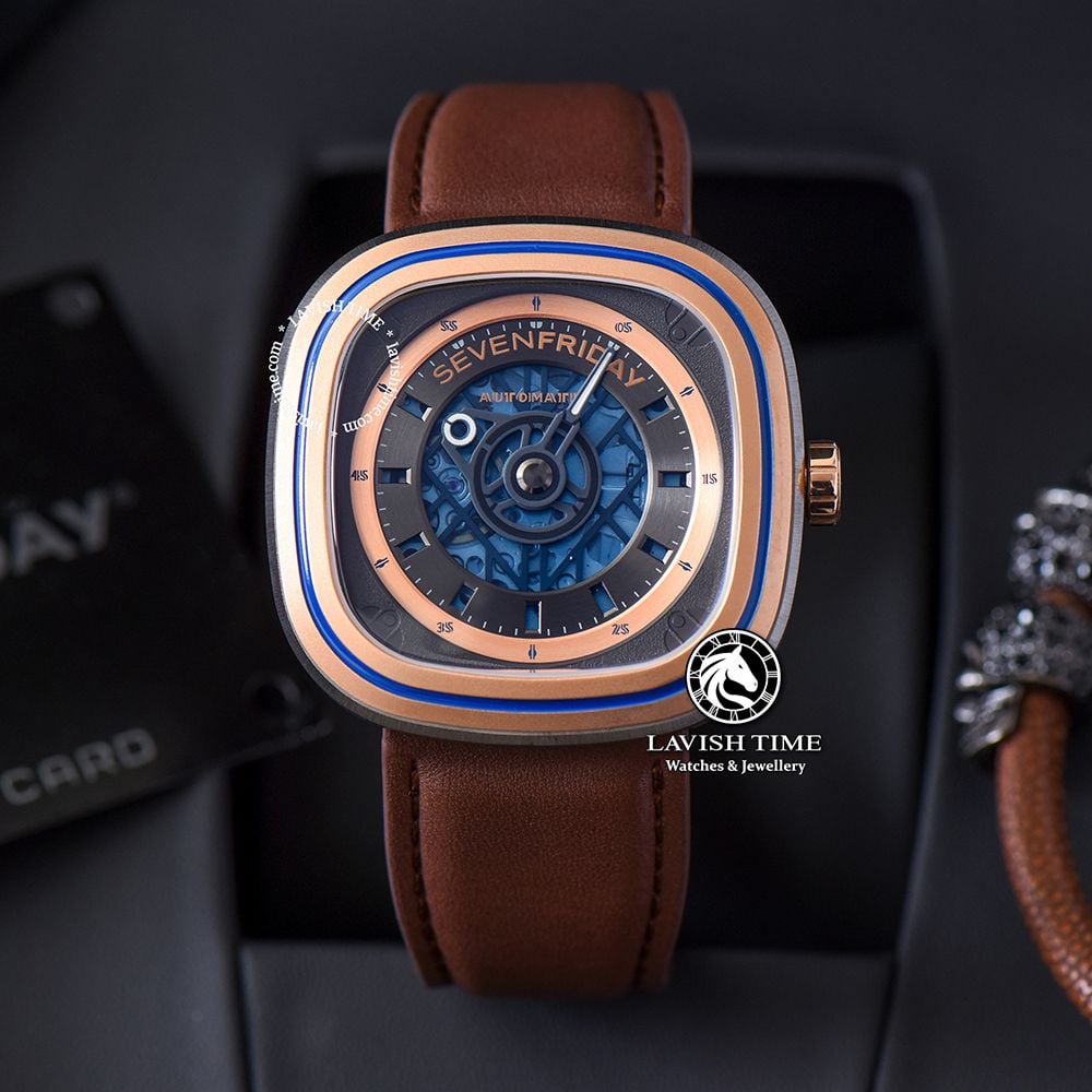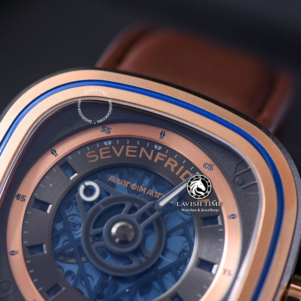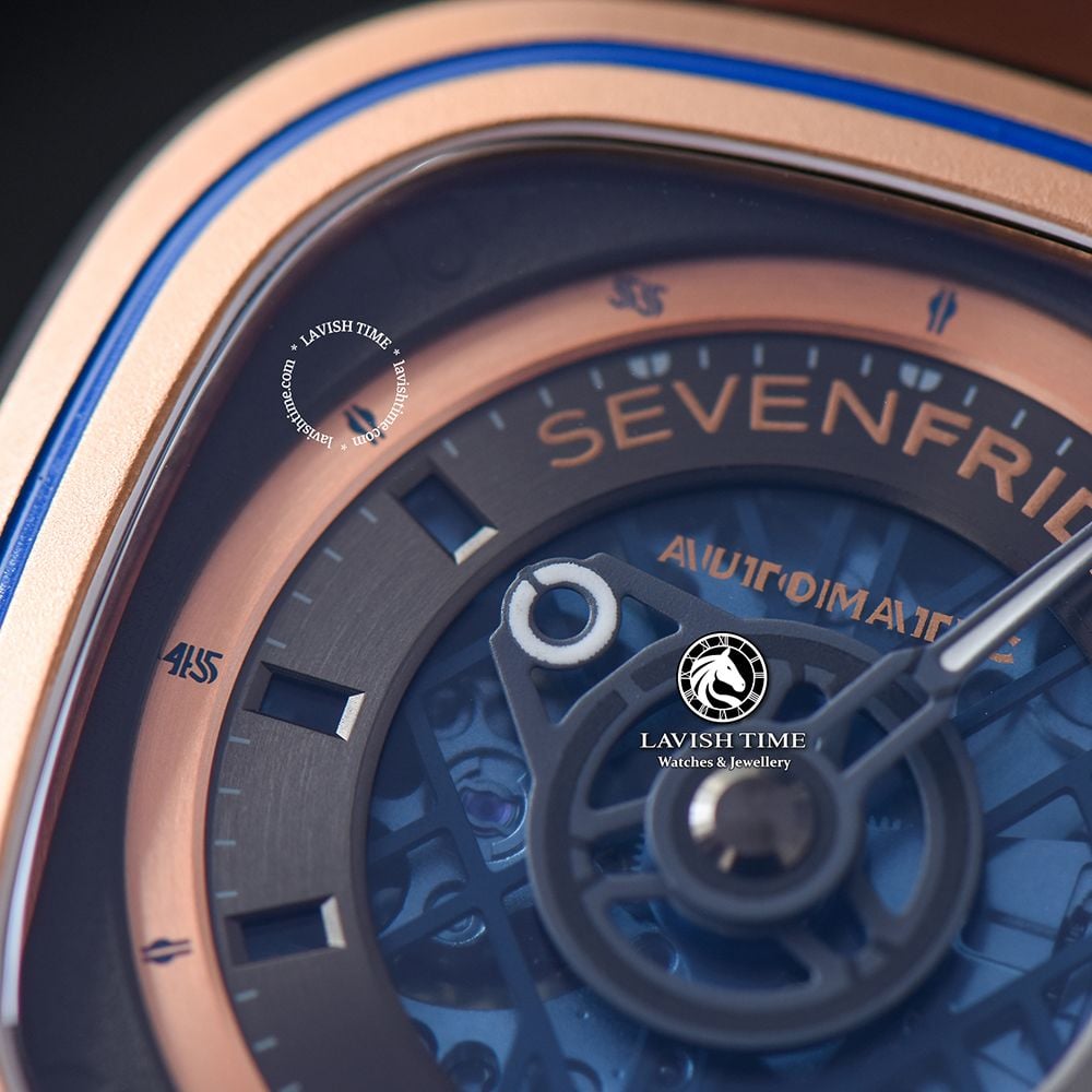 Bên cạnh đó, phần bên ngoài được làm từ kim loại phun cát ở các góc với hình dáng Roaring Twenties đặc trưng của thương hiệu SevenFriday. Kết hợp cùng vỏ thép không gỉ 316L mang vẻ đẹp của thời đại mới với vòng animation mạ PVD phun cát kết hợp cùng với vành bezel được chải xước mạ PVD vàng gold pha sắc xanh berlac.